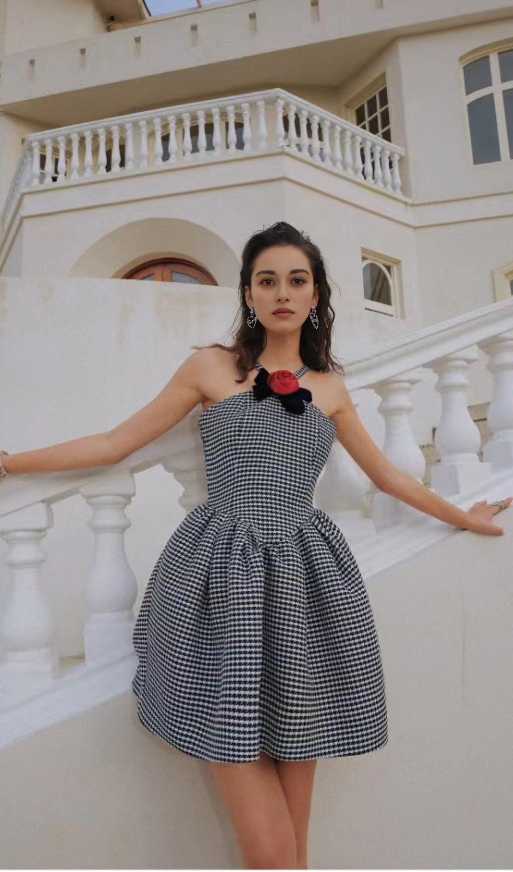 Embrace the risk-taking attitude of this daring dress with a stylish halter neckline. bold houndstooth print. and an eye-catching bow detail. Perfect for those who are not afraid to stand out and make a statement.