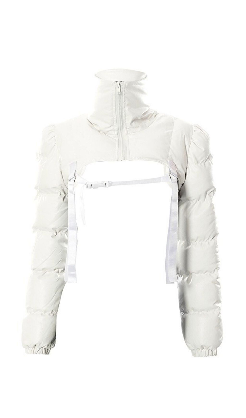 This is a short cardigan with long sleeves. The standing collar is designed to keep you warm. Adjustable straps on the front and back.