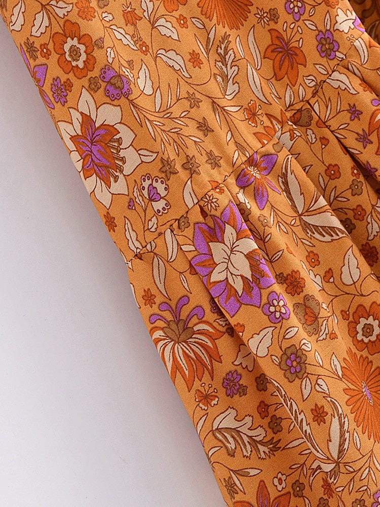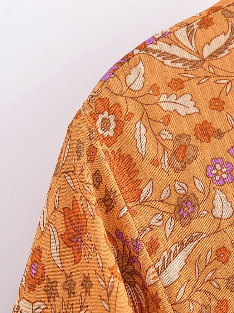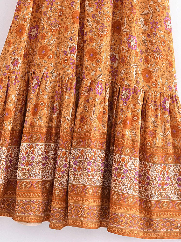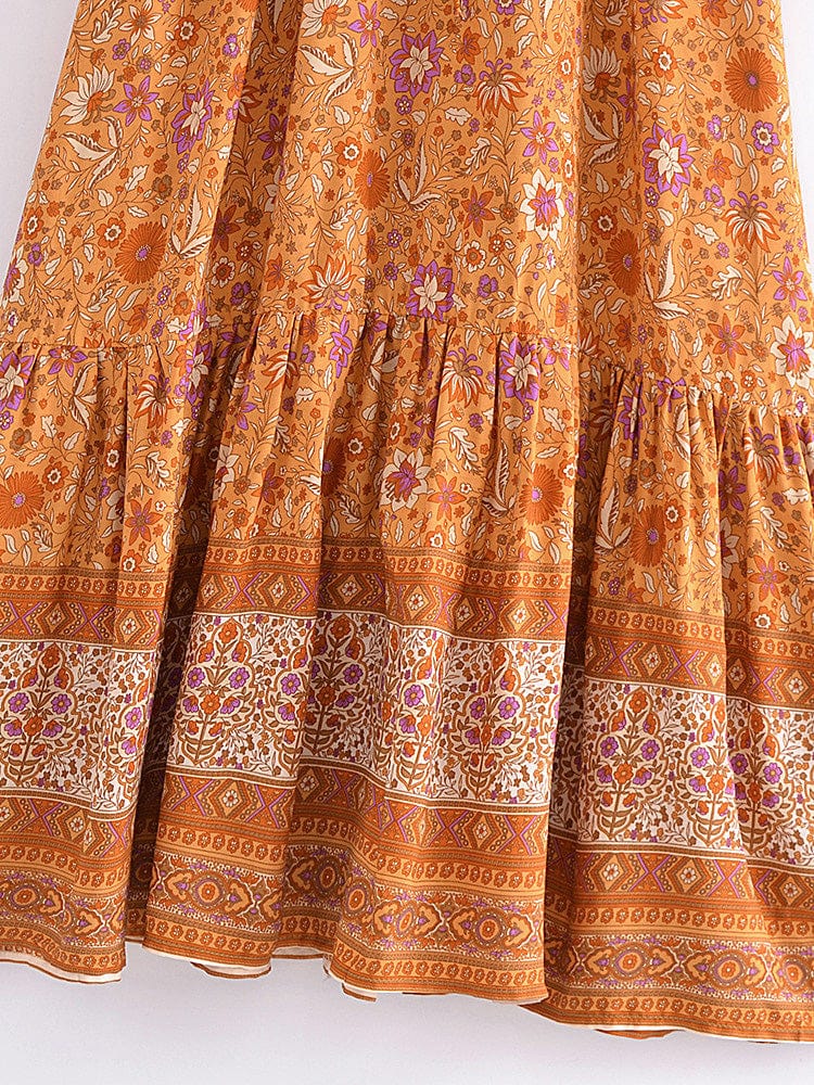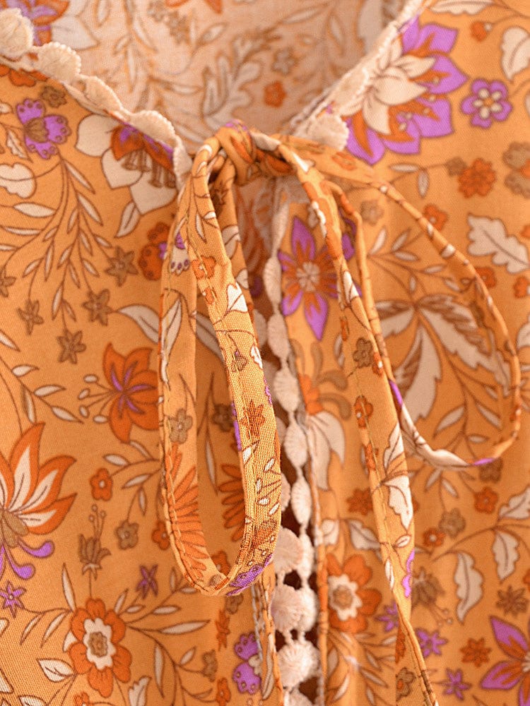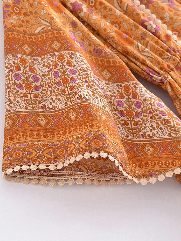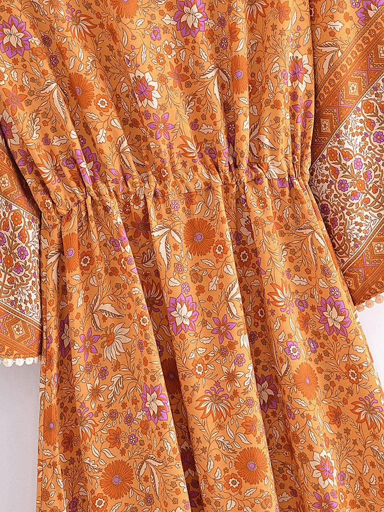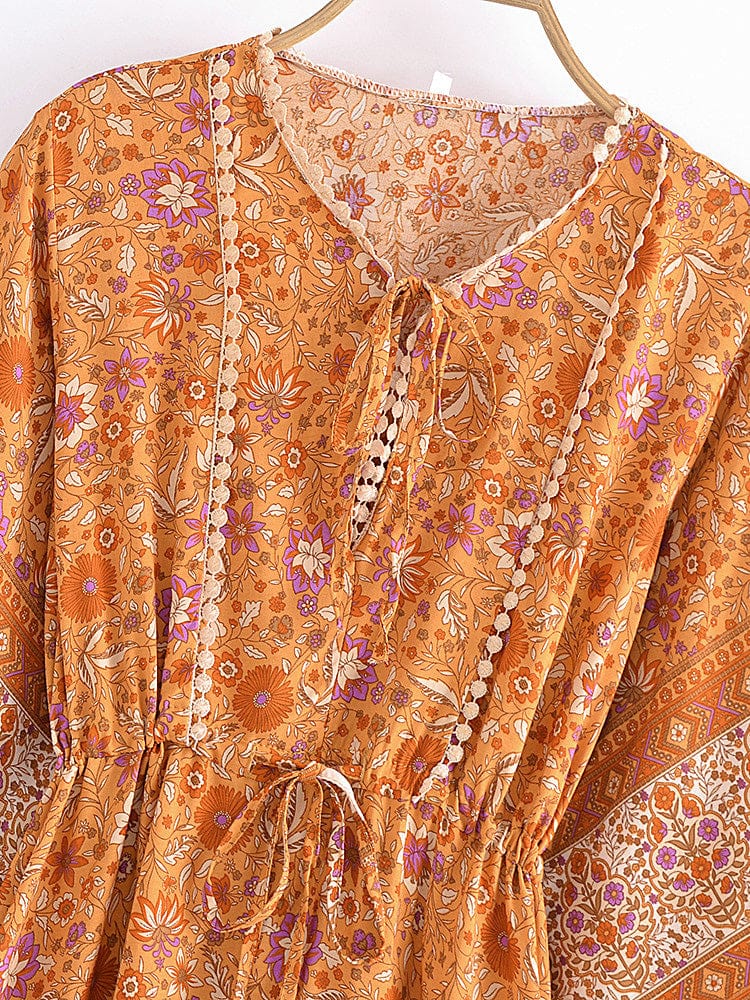 Summer airy ethnic Hyrmina Boho Maxi Dress. Loose style with V-cut neckline with ties. on the front and batwing sleeve. It has a drawstring in the middle to be adjusted with decorative ties at the end.