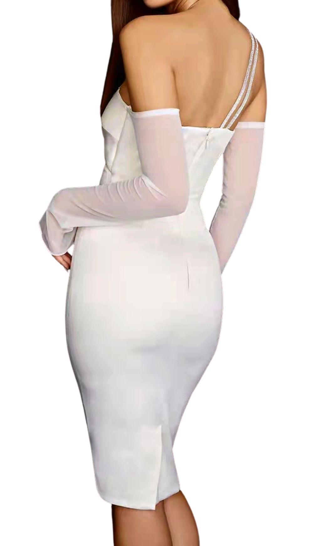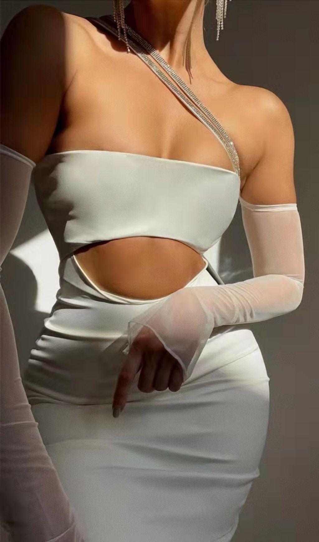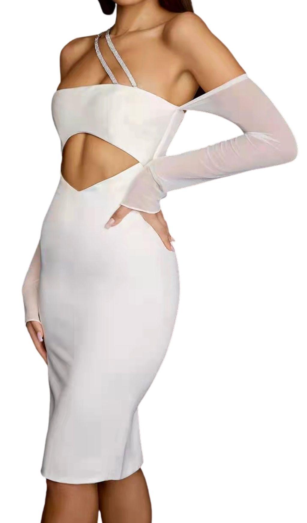 Get ready to turn heads and make a statement in our Cut Out Bodycon Midi Dress in Ivory. This stunning dress is perfect for various occasions. from romantic date nights to proms. wedding receptions. glam functions. and events. Its elegant design and figure-hugging silhouette will accentuate your curves and make you feel confident and beautiful.