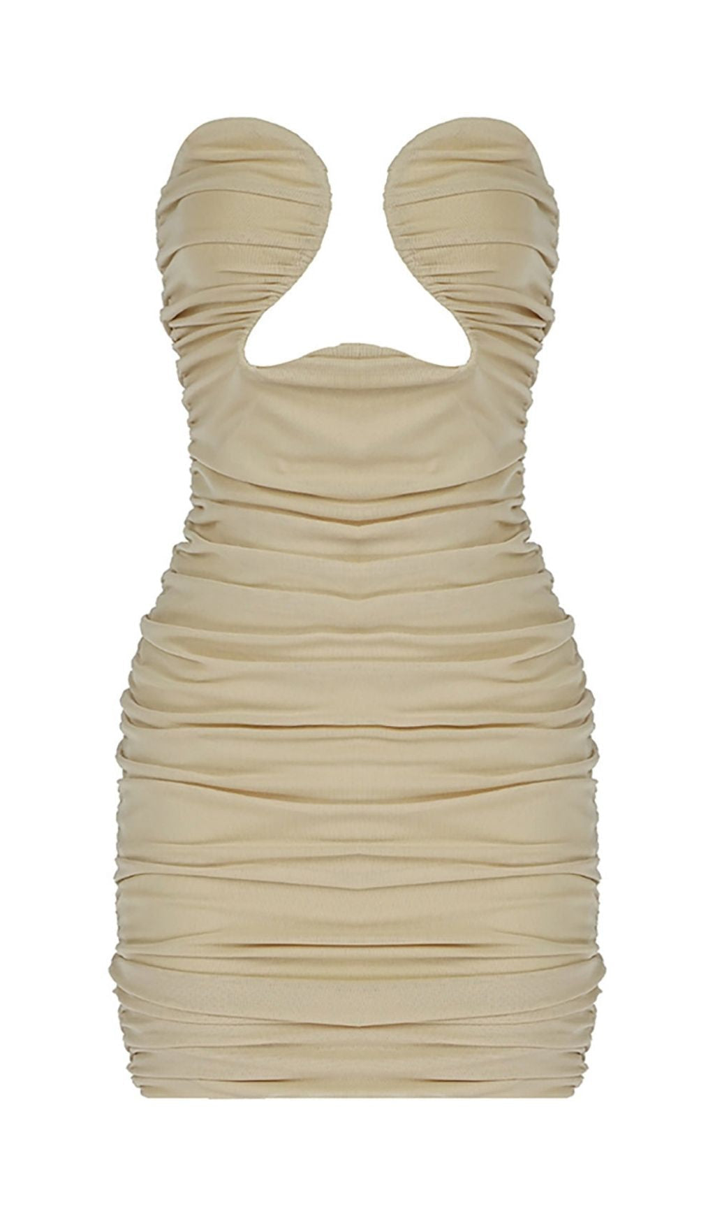 Make a statement with our Cut-Out Ruched Bodycon Mini Dress in Black. This dress is designed to turn heads with its alluring details and sleek silhouette. Whether you're going for a night out or a special occasion. this dress is the perfect choice.