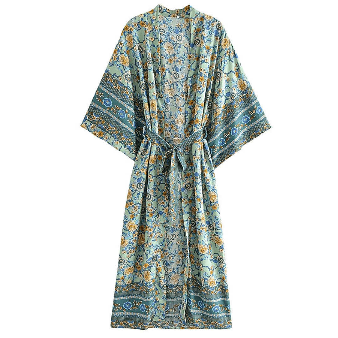 A green floral motif adorns this soft and lightweight kimono. This striking piece will add style to any outfit.