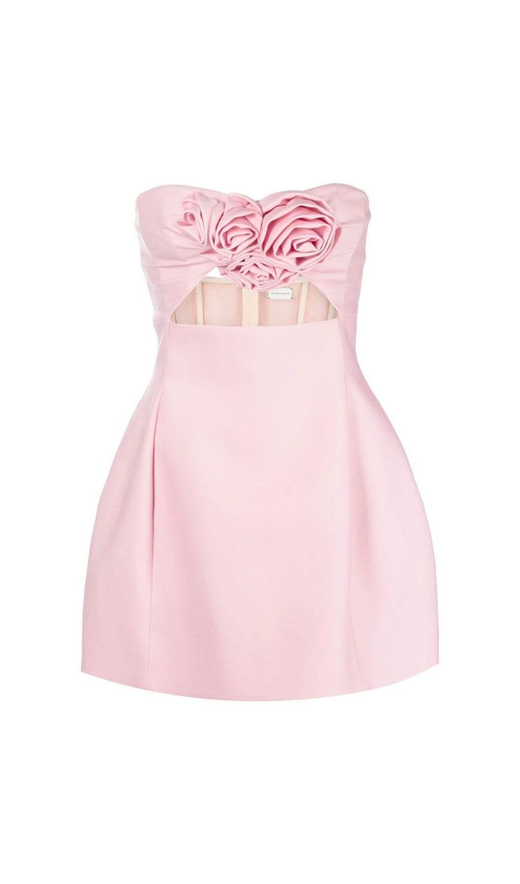 The Strapless Cutout Mini Dress is the perfect choice for those who want to make a stunning statement and stand out from the crowd. With its strapless design. 3D flower elements. and bold cutouts. this dress is guaranteed to turn heads wherever you go.