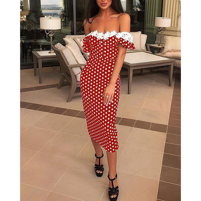 Redcit - Lace Applique Off Shoulder Dots Print Dress Women Cold Shoulder Polka Dot Red Summer Dress Slim Fit Casual Party Vestidos