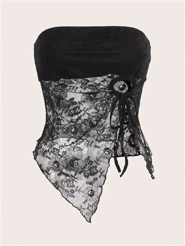 Lace Tube Summer Strapless Off Shoulder Front Drawstring Solid Color Slim Fit Mini Vest Irregular Hem Tank Crop Tops