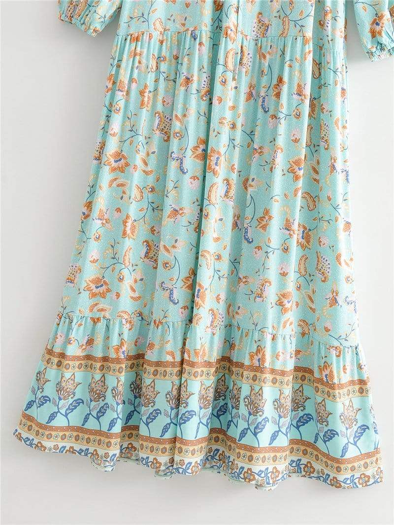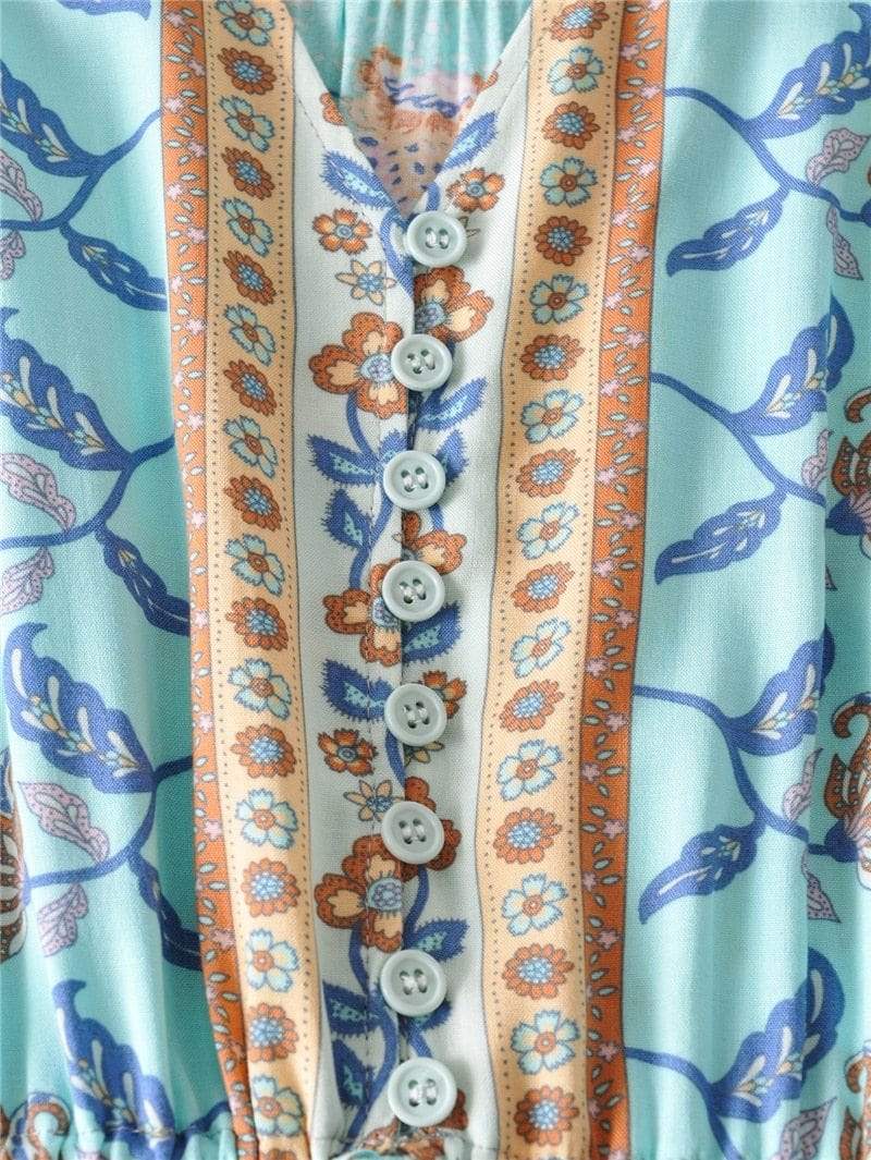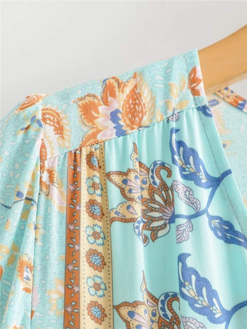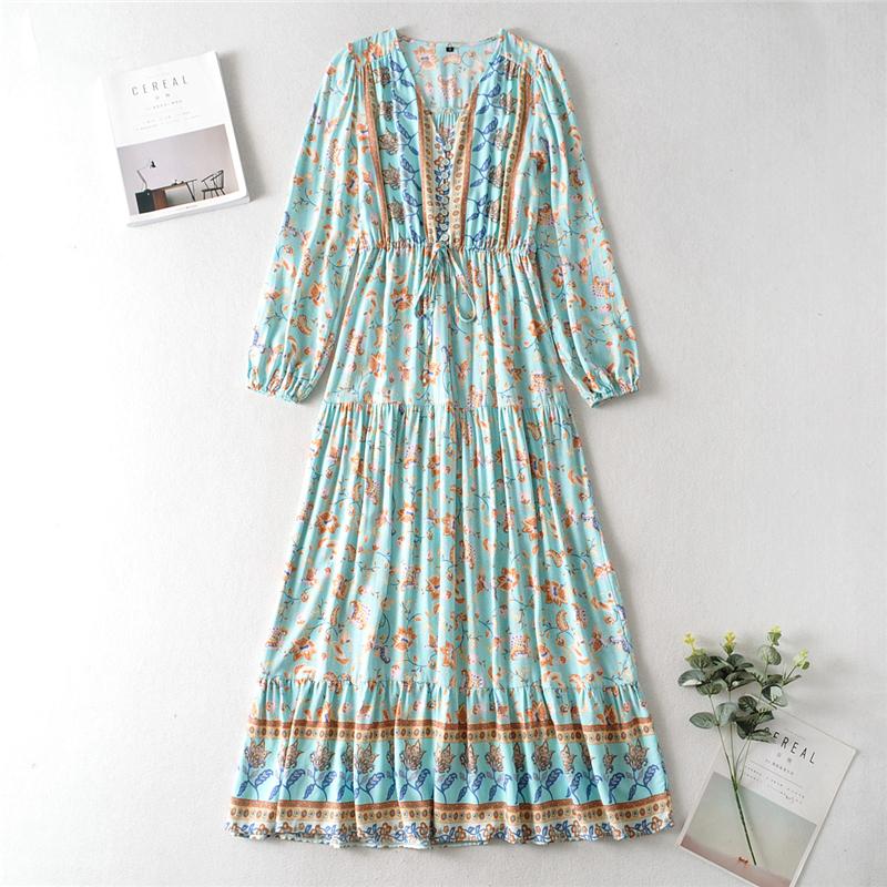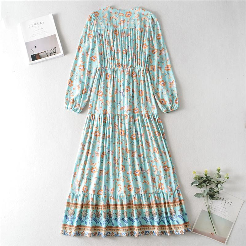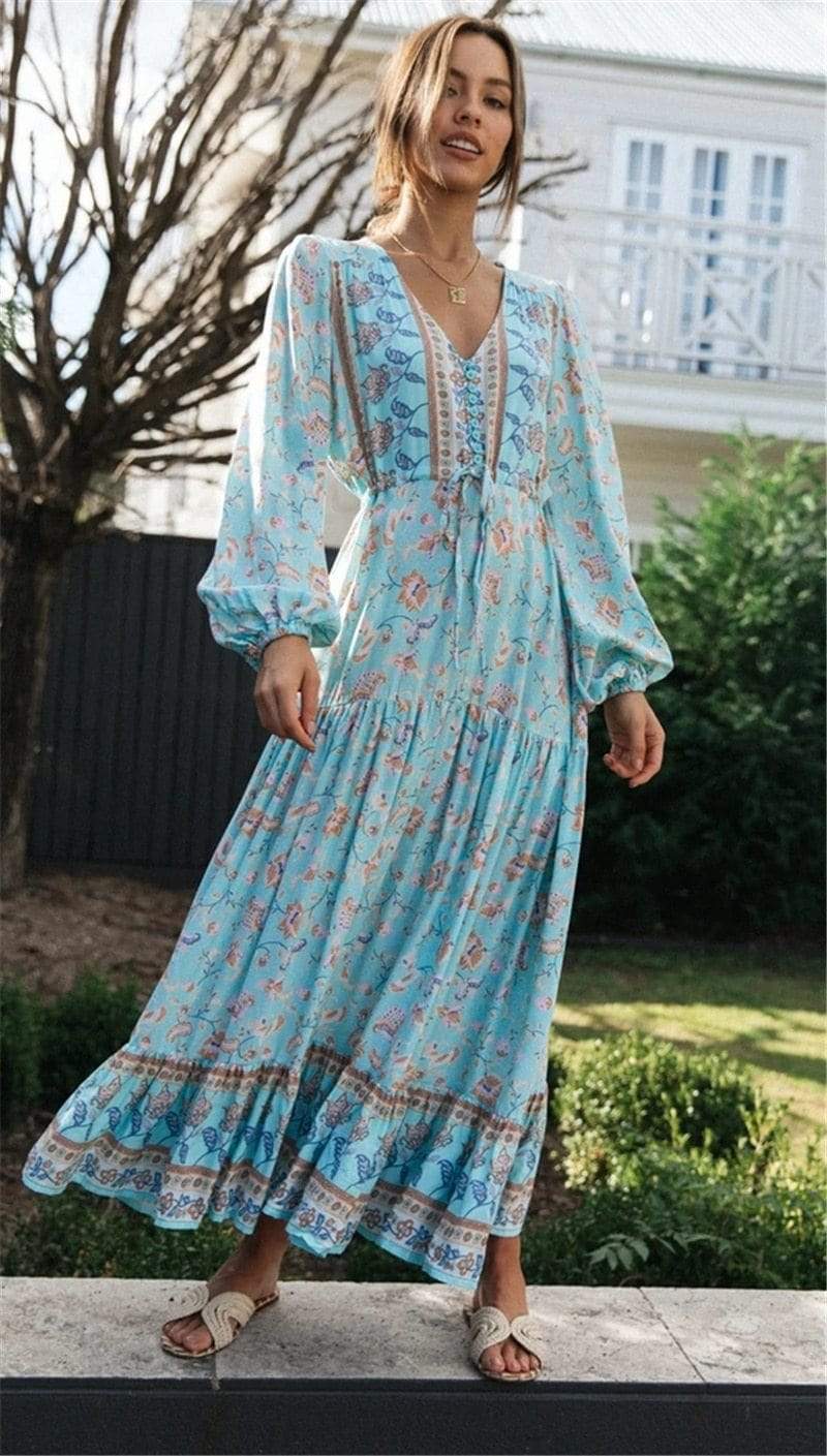 This gorgeous long sleeve boho dress has an elegant v neckline with a drawstring waistline and a loose fit. The top part of the dress is gathered together with a beautiful bow detail. The dress also features a pretty floral print throughout.