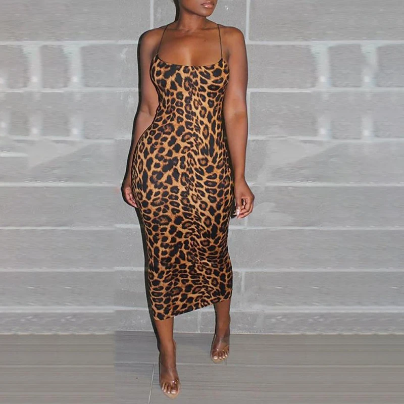 Redcit - Leopard print chiffon dress women Sleeveless thin strap midi summer dress party dresses robe femme vestidos mujer