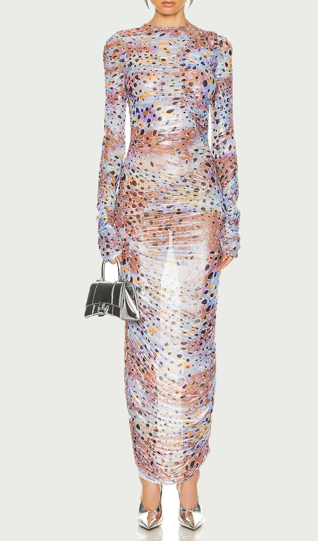 Made with sheer black fabric and silver polka dots. this dress gives a sophisticated touch to your look. With long sleeves. it's perfect for cooler weather. Upgrade your wardrobe and turn heads with this stunning dress.