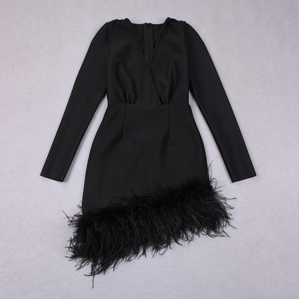 Introducing our ultra-chic little black dress with a playful vibe - the Long Sleeves Feather Mini Dress in Black. This dress is the perfect combination of elegance and glamour. featuring a deep V design and a fitted waist and under-breast line. But what truly sets it apart is the beautiful feathers that adorn the skirt. adding a touch of sophistication and femininity.