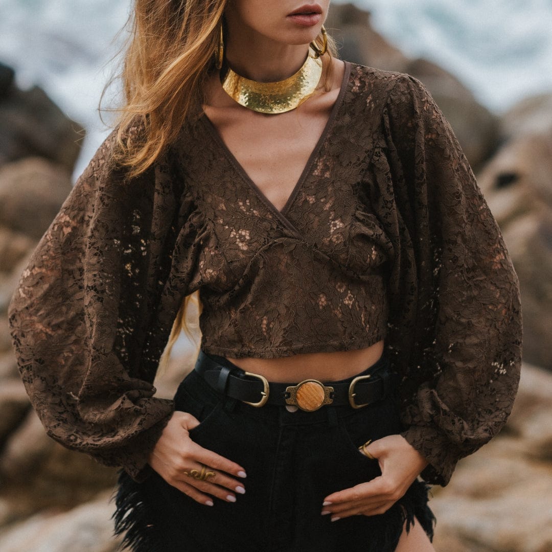 About: Turn heads in this timeless blouse with a v-neckline. exaggerated keyhole cutout. and highly exaggerated sleeves for additional shape in a boho-lace-inspired silhouette.