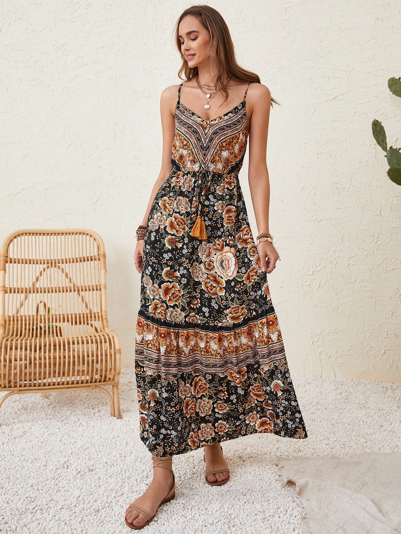 Flowy and floral. the Luna Boho Maxi Dress will have all eyes on you! This Viscose dress comes with a tie element. a V-Neck neckline. and spaghetti straps for an ultra-chic look that'll make sure you stand out in a crowd. It's maxi-mum style for a maxi-mum wow factor!