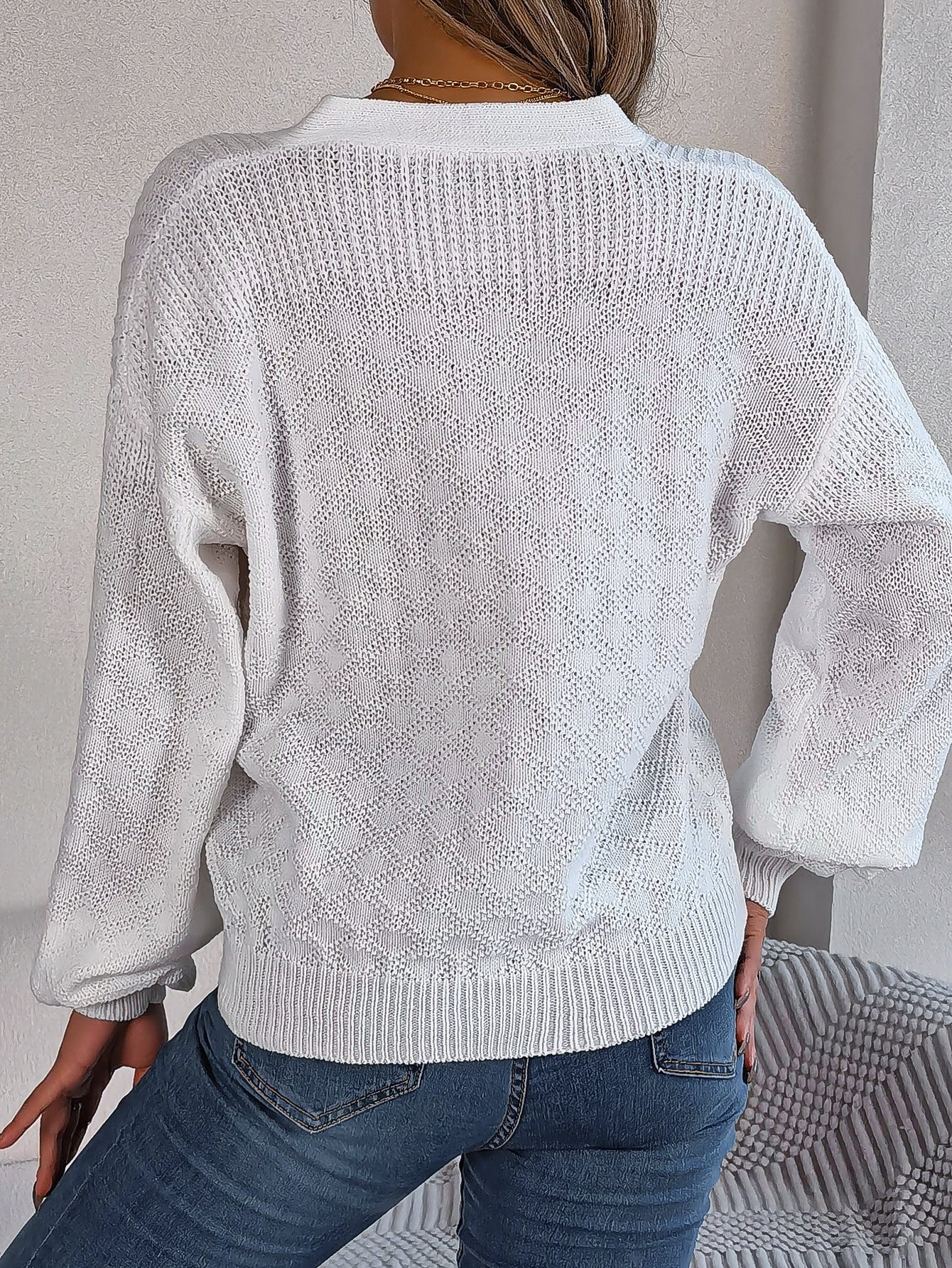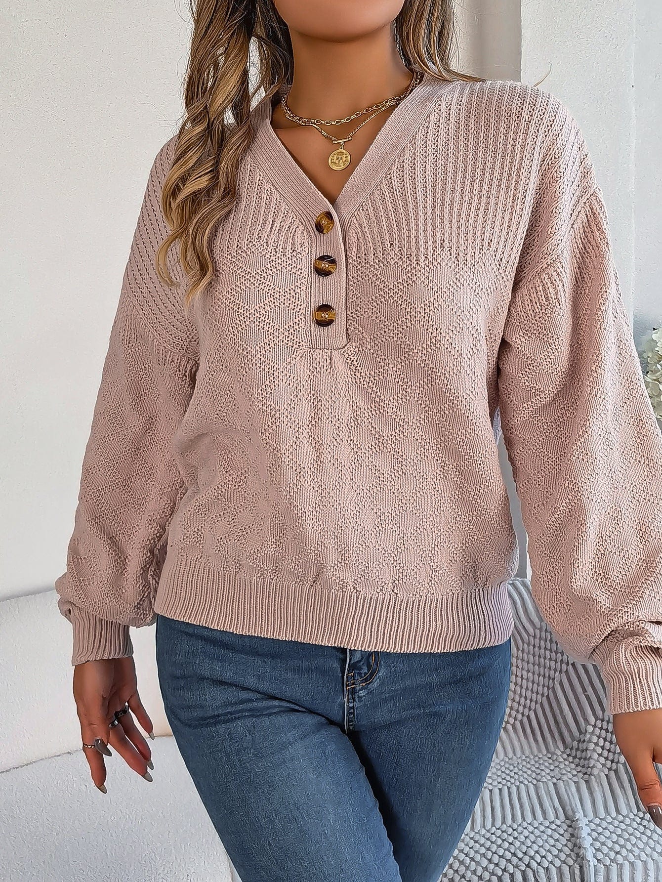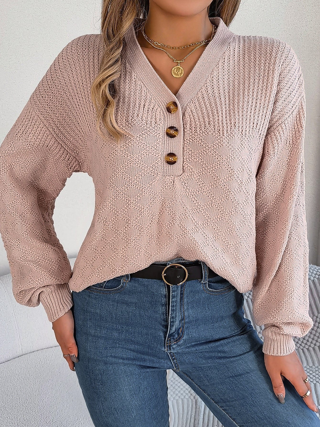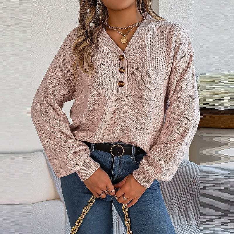 Greet the new season in style with the Lysandra Knitted Sweater! This cozy polyester sweater is sure to keep you warm through the colder months. With a V-neckline. button closure. and elasticized cuffs. you'll look effortlessly chic and ready to take on the day. And with its roomy. loose fit. you'll be comfy-as-can-be!