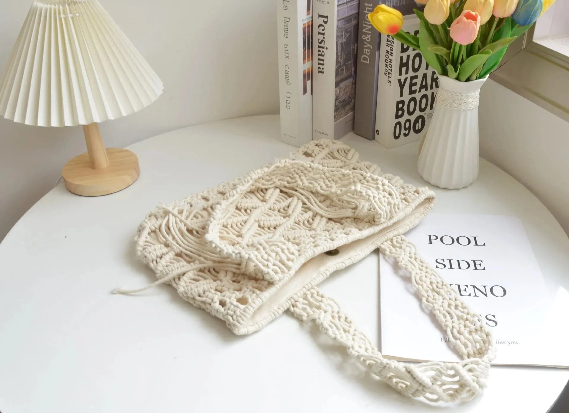 This macramé bag offers convenience and comfort while accentuating your individual style. Elevate your look with this trendy yet timeless accessory that embodies the beauty of craftsmanship and functionality in one charming package.