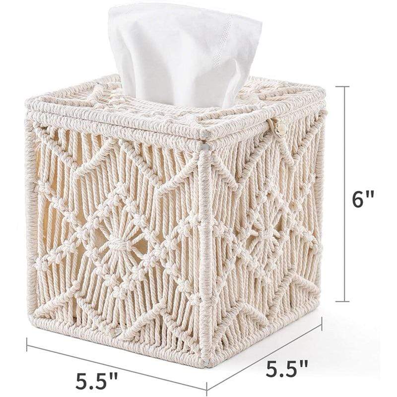 About:  The Macrame Napkin Box is the finishing touch for your farmhouse or boho home; you can use it to store your tissue box. cover your spare toilet paper roll. and give a touch of bohemian flair to your kitchen or bathroom.