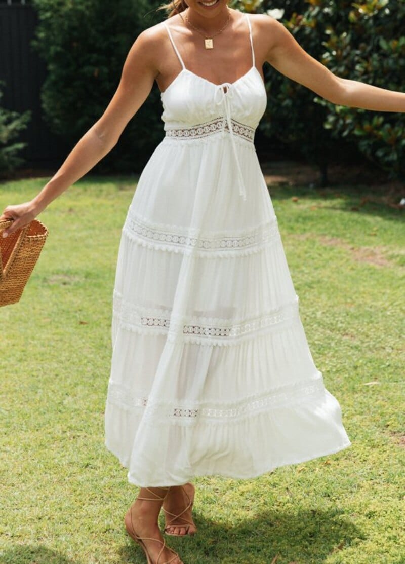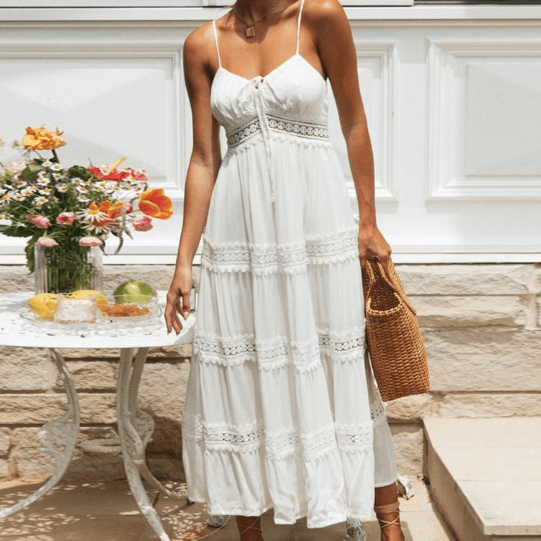 Our Madison Boho Maxi Dress is elegant and trendy. and it's ideal for displaying your femininity. For a more comfortable fit. the bustier is smocked. The soft and light cotton fabric is embellished with openwork embroidered accents. In this long. bohemian-style dress. you can be sure to make a statement for a classy evening out or a picnic with friends.