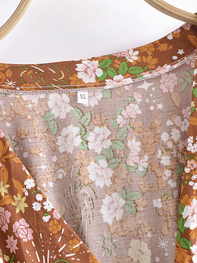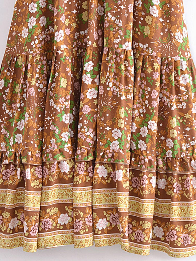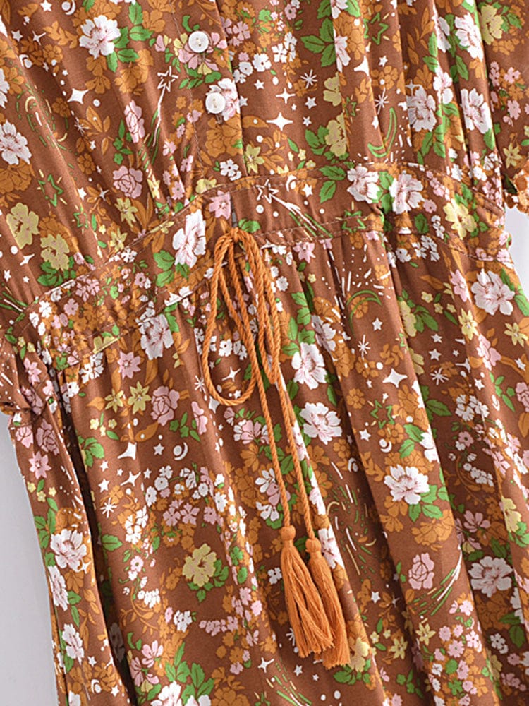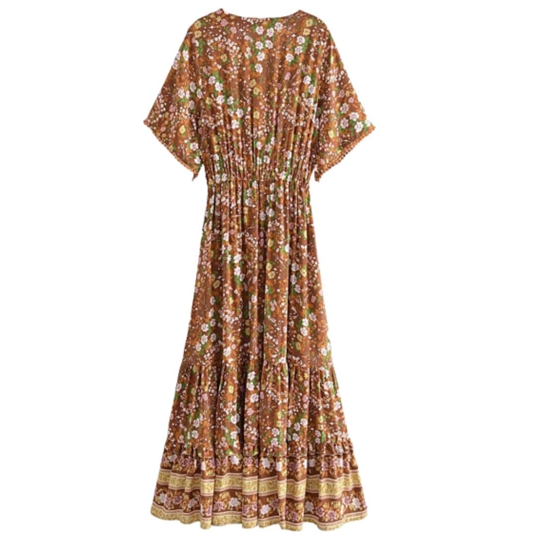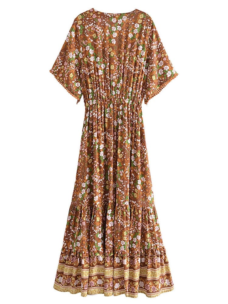 Tap into boho-chic with this Mahala Bohemian Maxi Dress. Designed with a V-cutout neckline with buttons detail. a high drawstring waist with hanging tie. and Insert ladder detail trim for a feminine feel-good style.