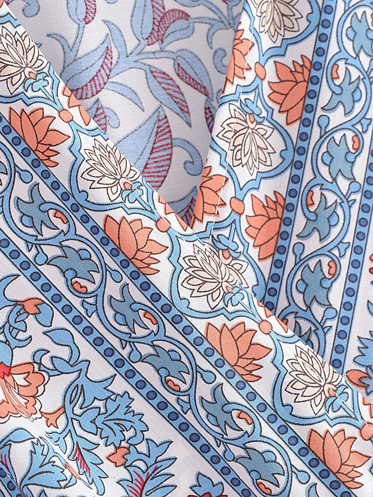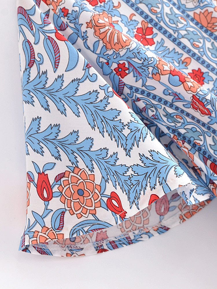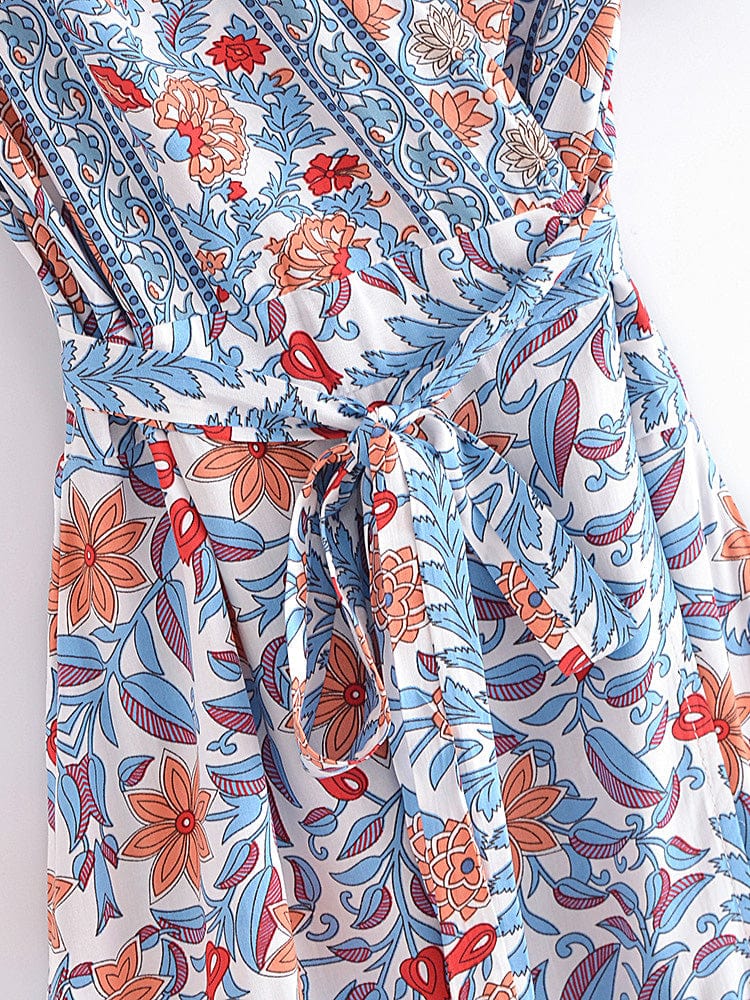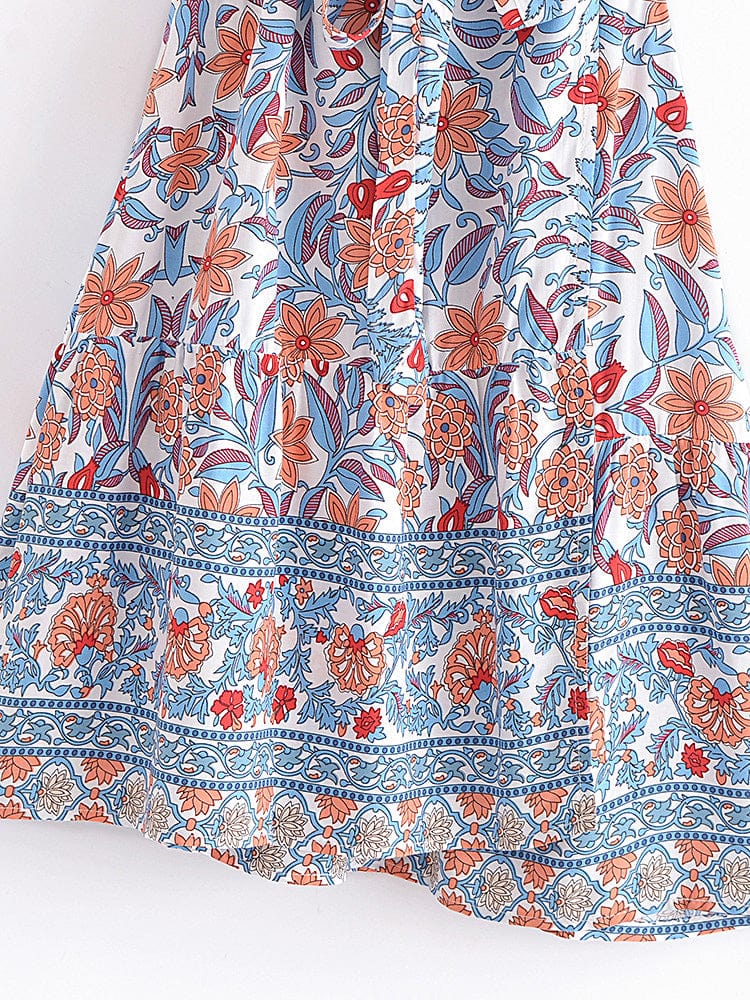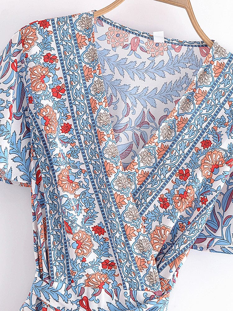 Our lovely Milena Boho Mini Dress is feminine and floral. with a classic tie-up silhouette. a v-neckline at the top. and short batwing sleeves for extra dimension.
