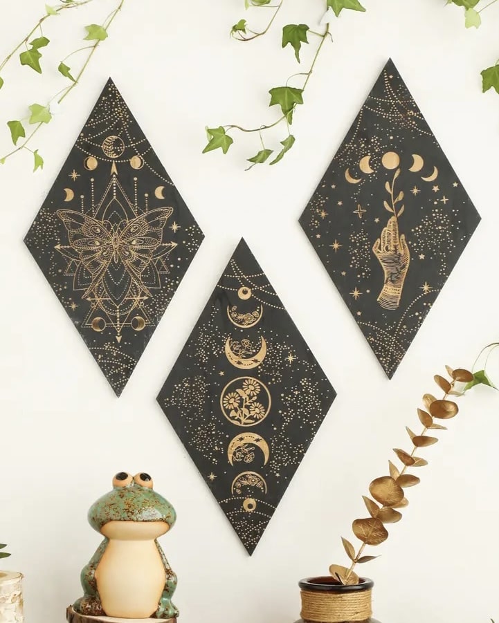 Enhance your space with this Moon Phase Wall Decor. a captivating piece for those who love witchy room decor or boho aesthetics. Crafted from high-quality wood. this black moon phase wall art features intricate details that evoke a tarot-inspired design. perfect for creating a mystical atmosphere. Its rhomboid geometric shape adds a unique touch to any room. whether it's a witch bedroom. living room. or meditation space.