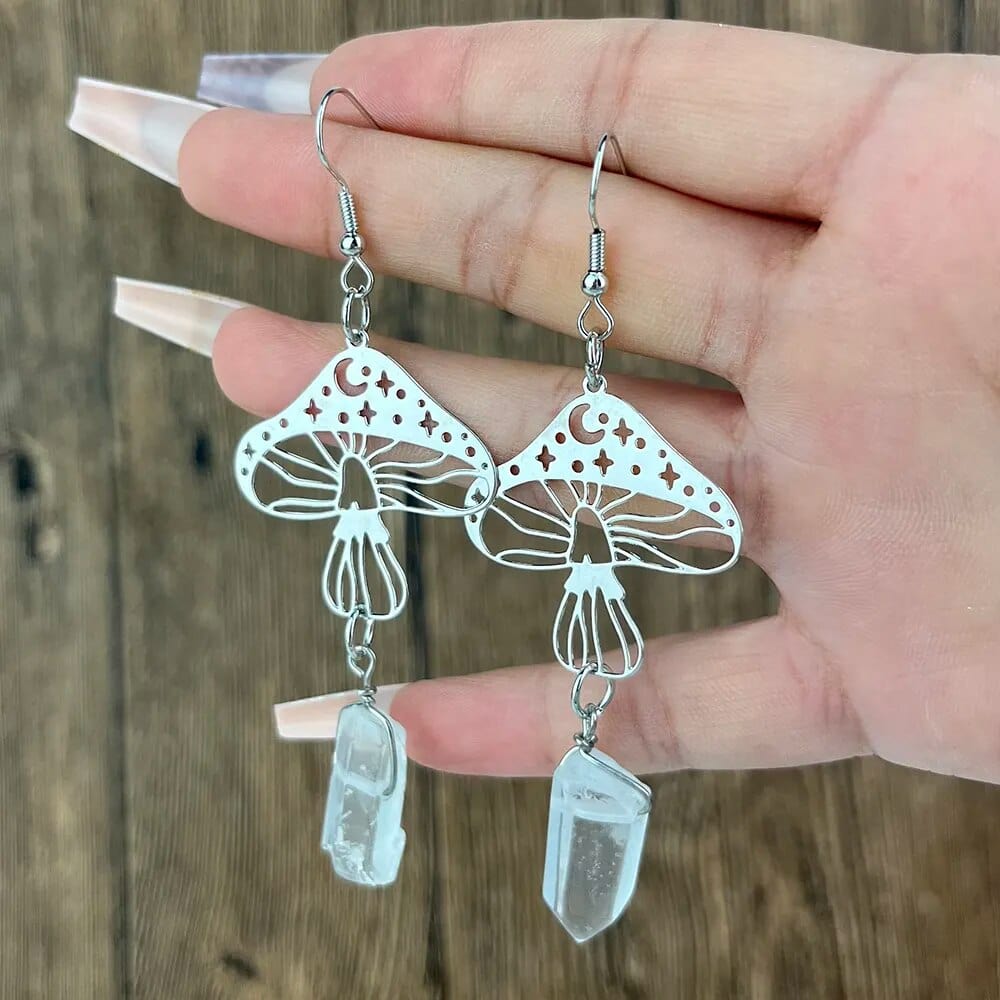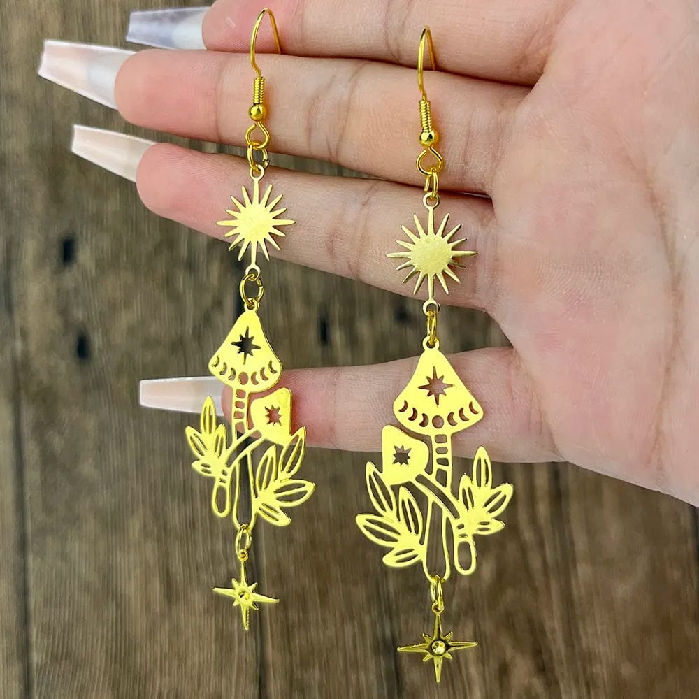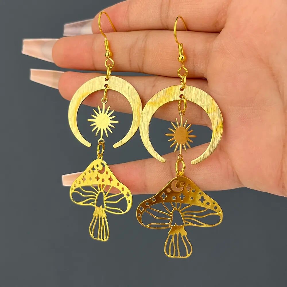About: Mushroom earrings with enchanting sun and crescent moon details - perfect for adding some boho vibes to your look! Elegant enough for a night out. plus fun and quirky for every day.