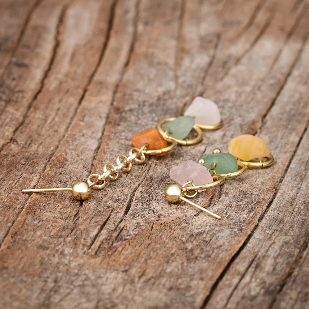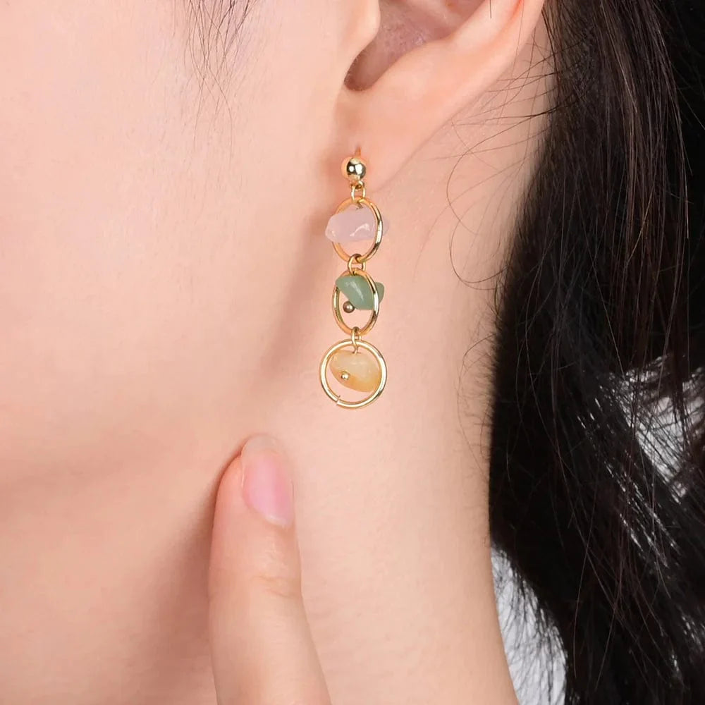 These unique earrings feature raw crystal stones delicately hanging from intertwined loops. Each pair is handcrafted from natural stones. making them a distinctive addition to your jewelry collection.