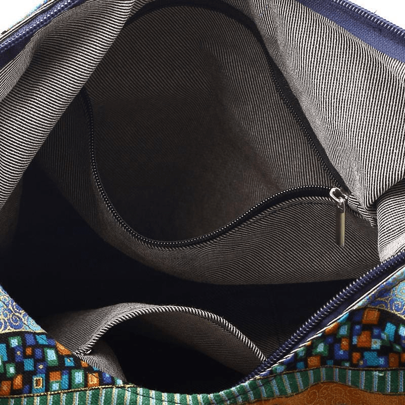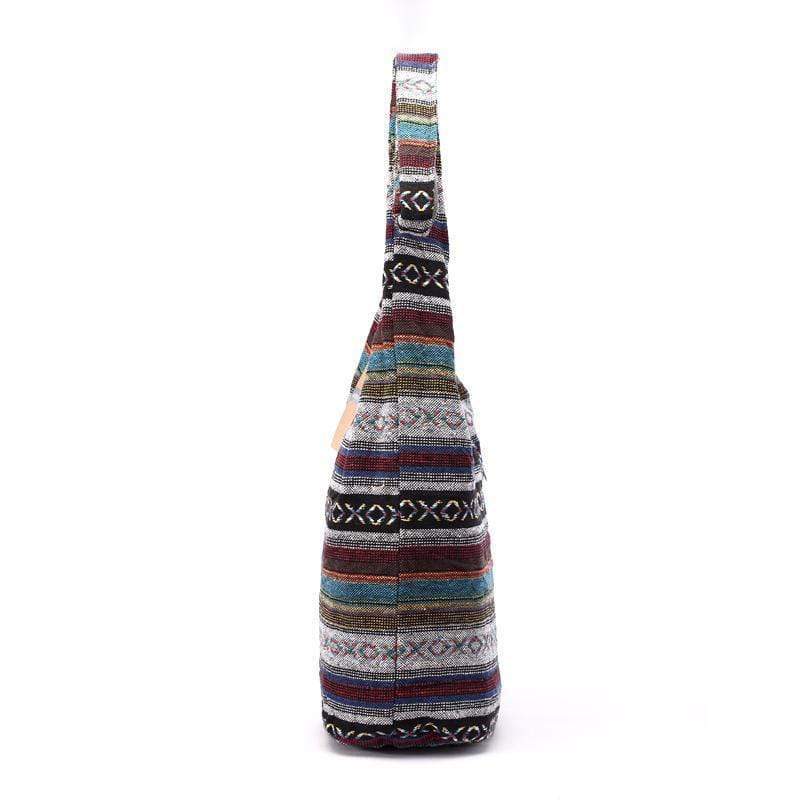 About: Aztec patterns highlight the Bohemian style of this bucket bag crafted from cotton fabric.