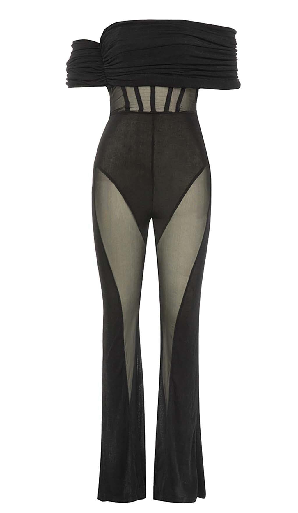 Elevate your style with our Off Shoulder Mesh Jumpsuit in Black. This stunning jumpsuit is designed to make a sleek and chic statement. perfect for any occasion. With its sultry off-shoulder sleeves. it adds a touch of allure to your look.