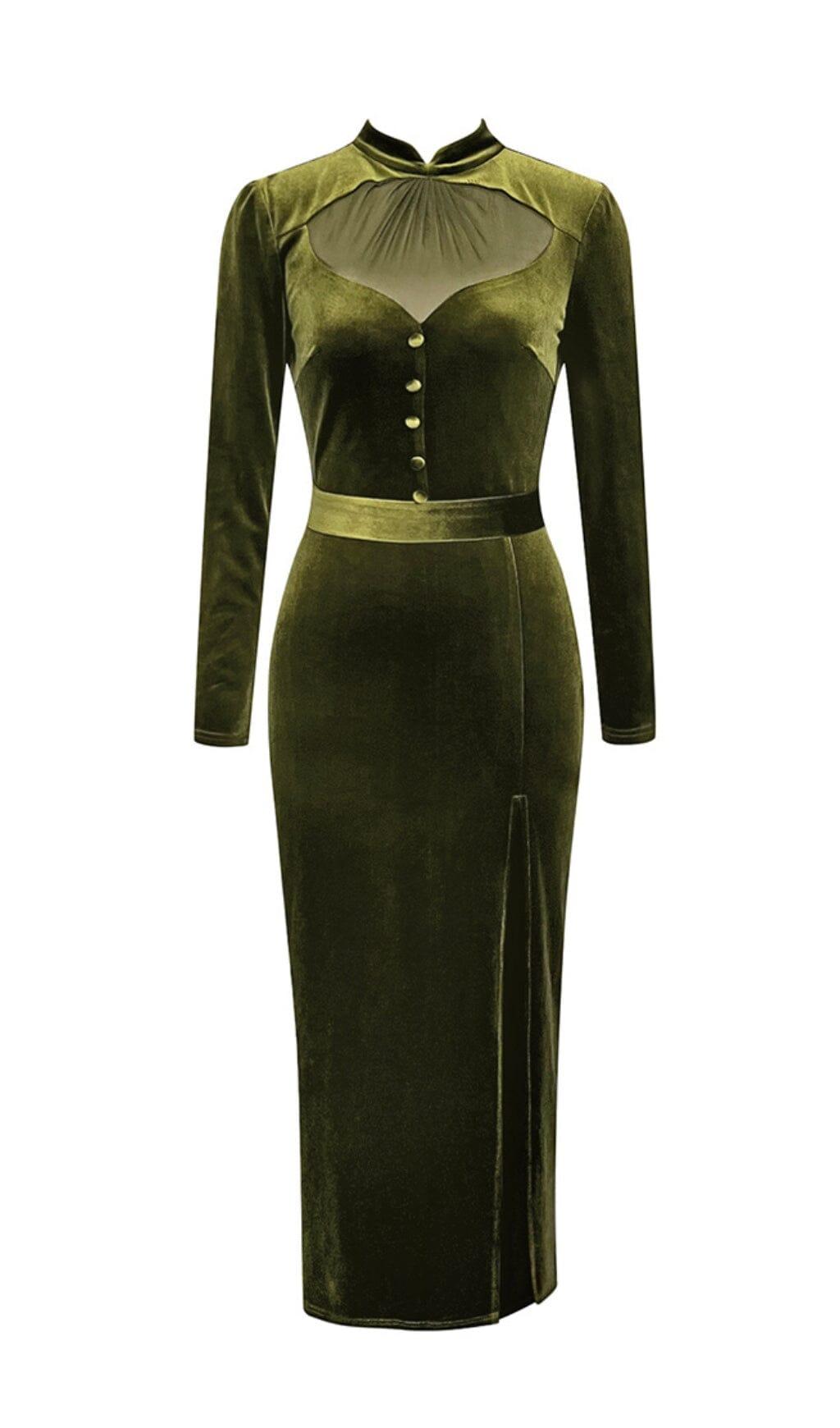 This ultra-luxurious Olive Green Mesh Velvet Slit Hip-Hugging Dress is the perfect combination of sophistication and modern style. Crafted from the finest quality mesh velvet and designed with a slanted slit. this dress exudes elegance and finesse. Revel in the comfort of its snug hugs and stencil your look in the contemporary chicness of this dress.