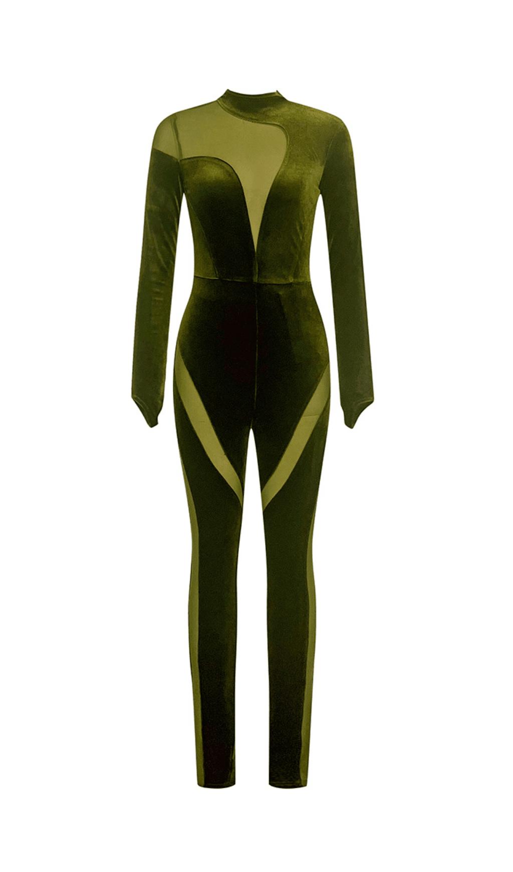 Be the envy of your friends with the jumpsuit. Luxe velvet is elevated with long sleeves and a tantalizingly tight mesh bodice. creating a look that epitomizes contemporary elegance. Whether you want to turn heads in the boardroom or on the dancefloor. this jumpsuit is sure to make an impact.