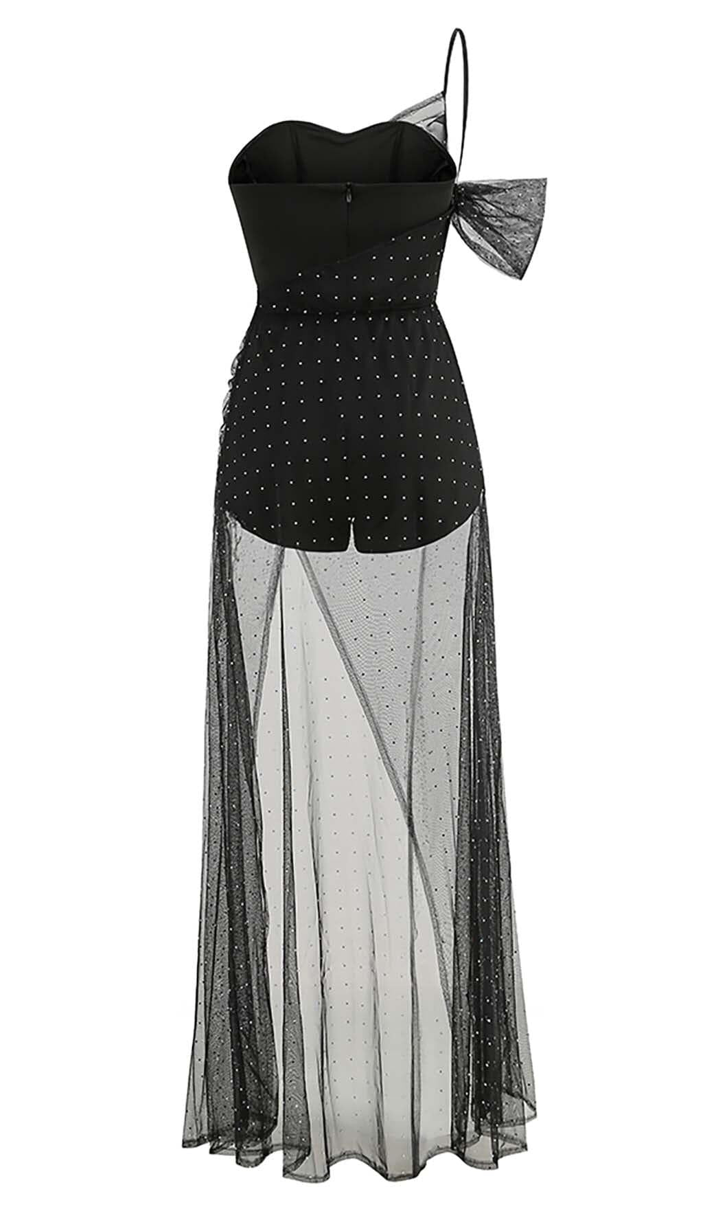 Make a statement and leave a lasting impression with our one-shoulder rhinestone mesh maxi dress in black. Shine brighter than the stars and exude elegance and grace with every step you take. Choose quality. style. and unparalleled beauty. Choose our maxi dress.
