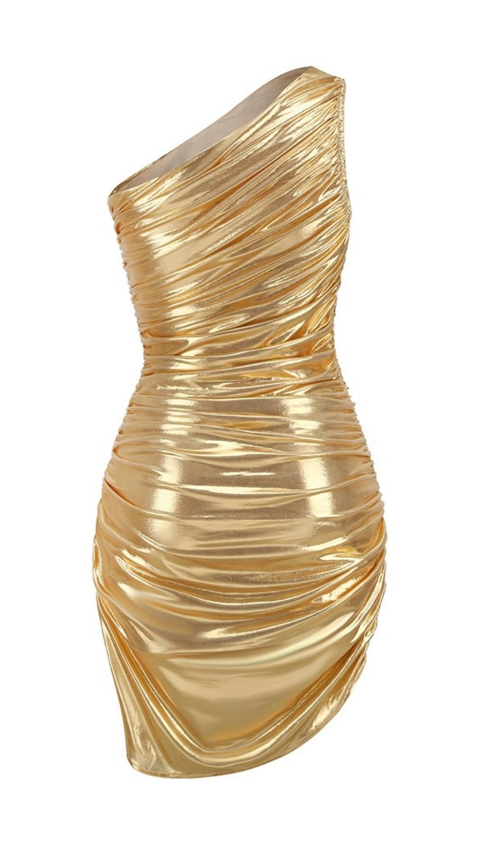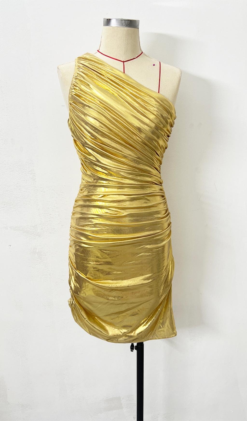 Get ready to turn heads in our stunning One Shoulder Ruched Mini Dress in Gold. This dress combines sultry and feminine elements to create a show-stopping look. With its one-shoulder design and pleats. it's the perfect dress for any special occasion.