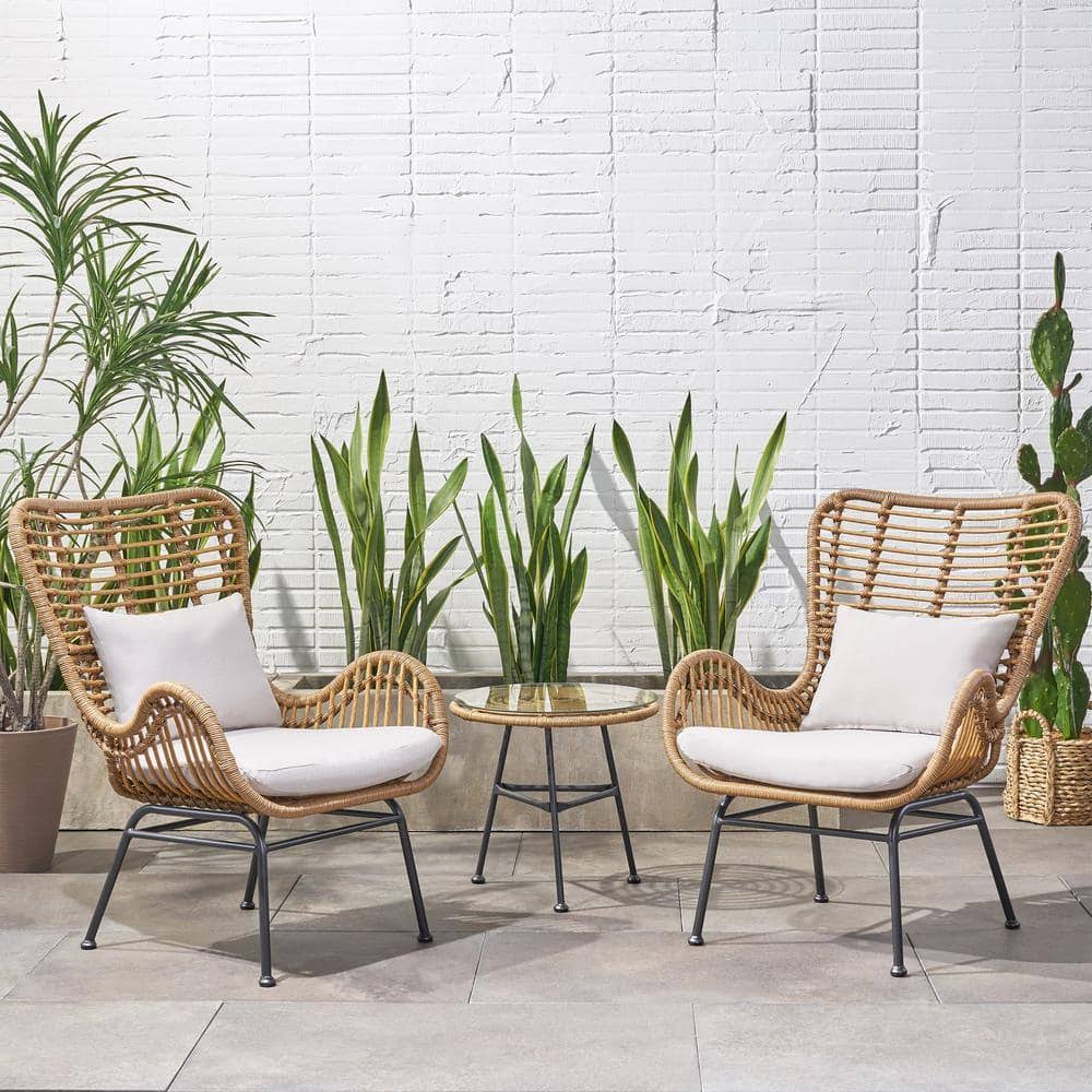Create a sleek outdoor setting with this 3 Piece Wicker Chairs and Table Set. Featuring a modern design with round edges and thin angled legs. this set is crafted from durable polyethylene rattan and water-resistant cushions. Plus. the table includes a tempered glass top for a timeless look.