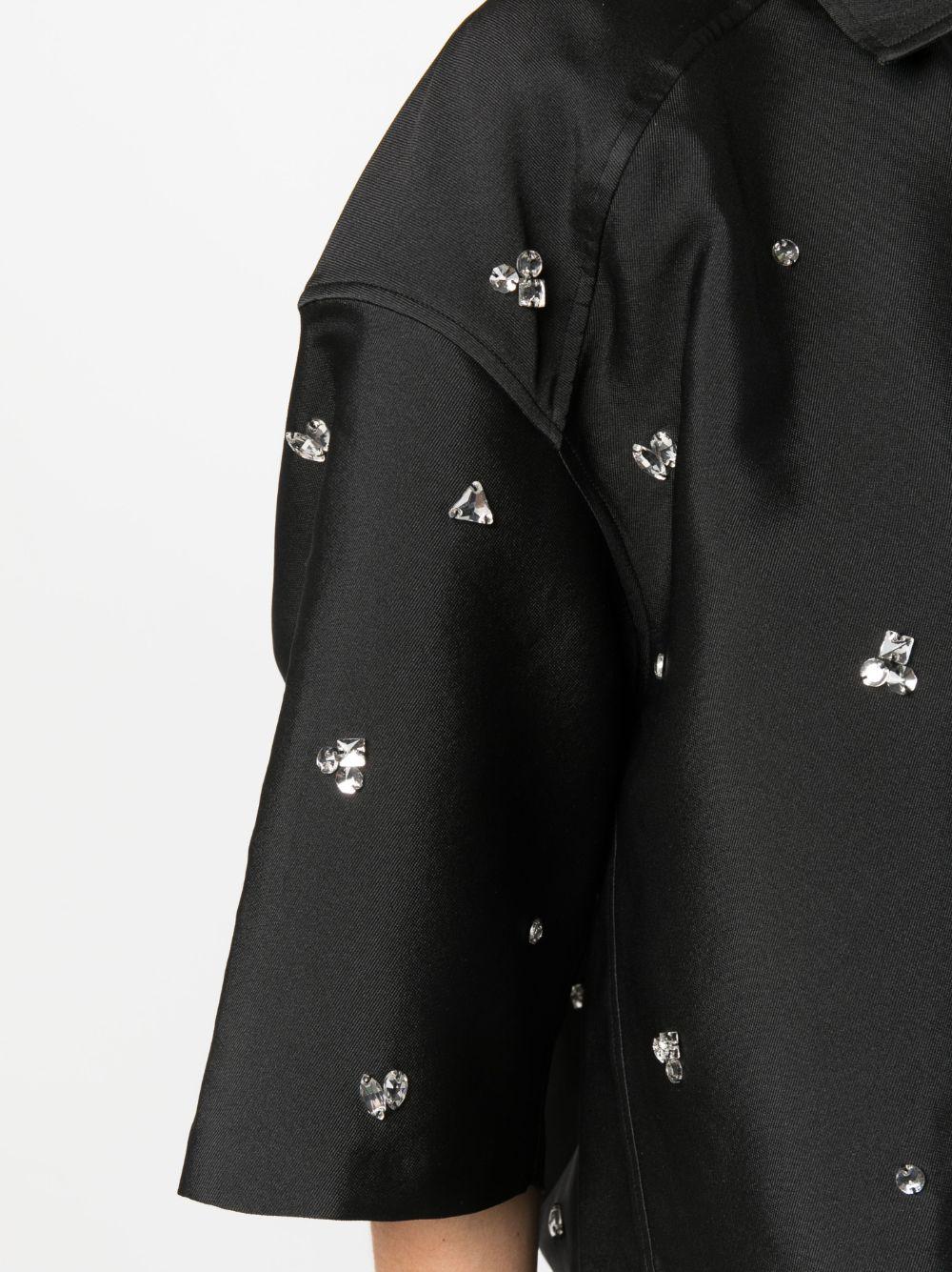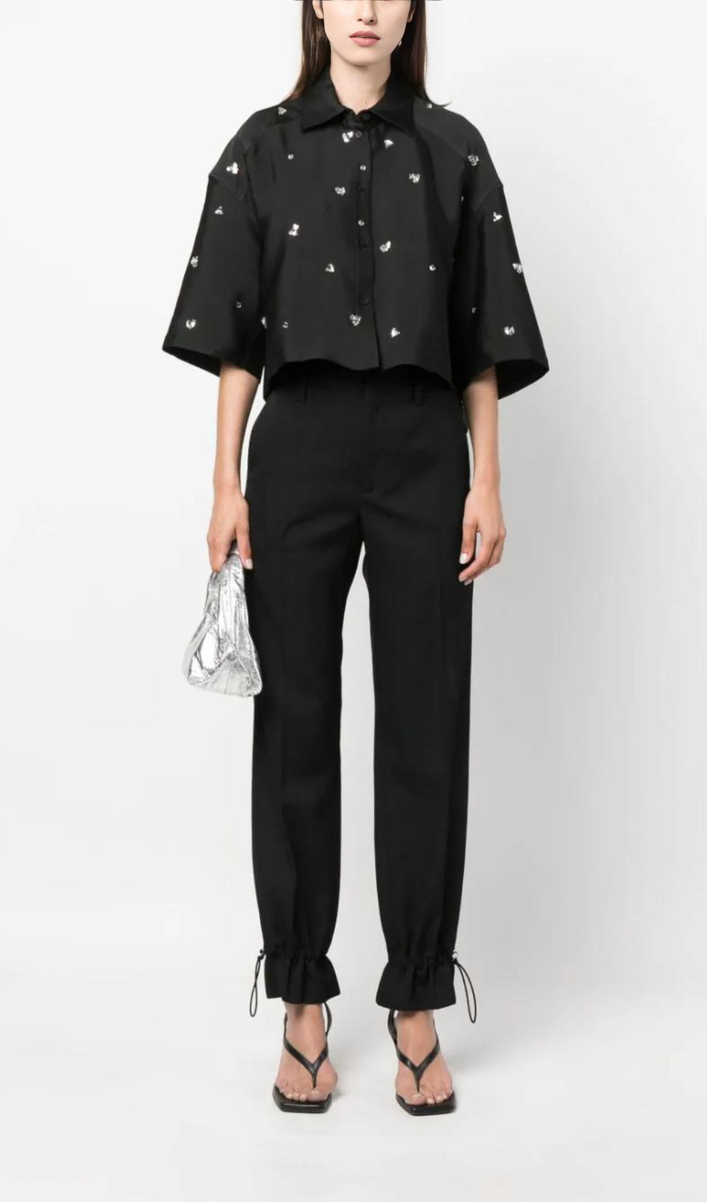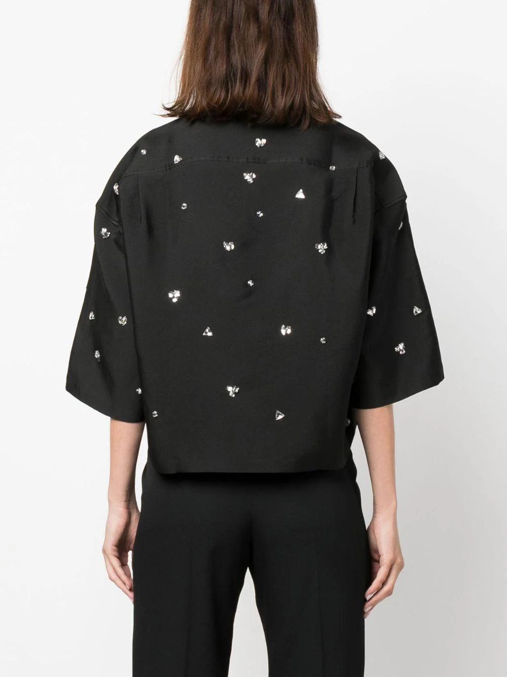 Made with high-quality fabric. this shirt offers a comfortable and stylish oversized fit. The cropped design adds a trendy touch. while the embellished details elevate the overall look. Perfect for making a statement and standing out in any crowd.