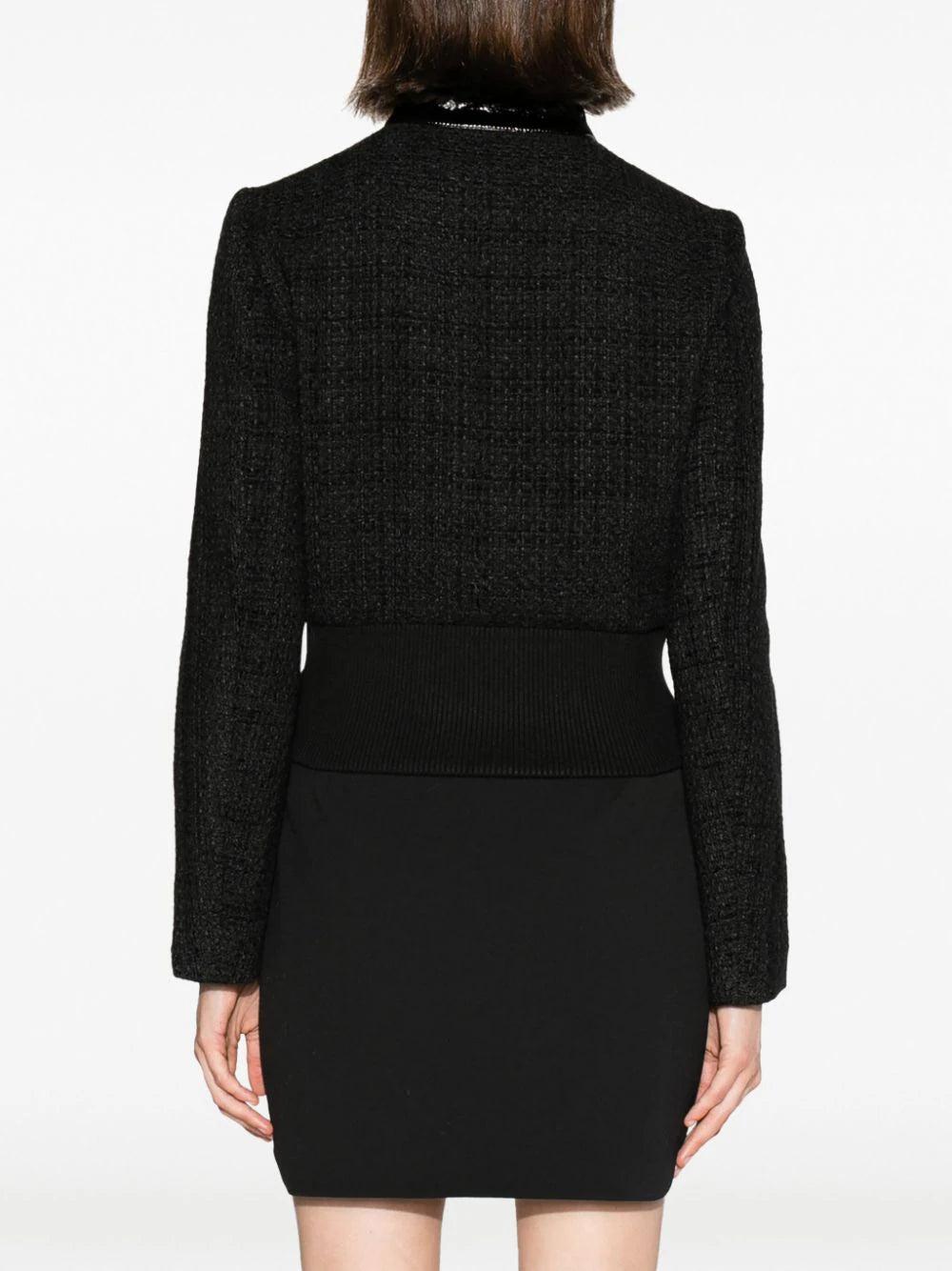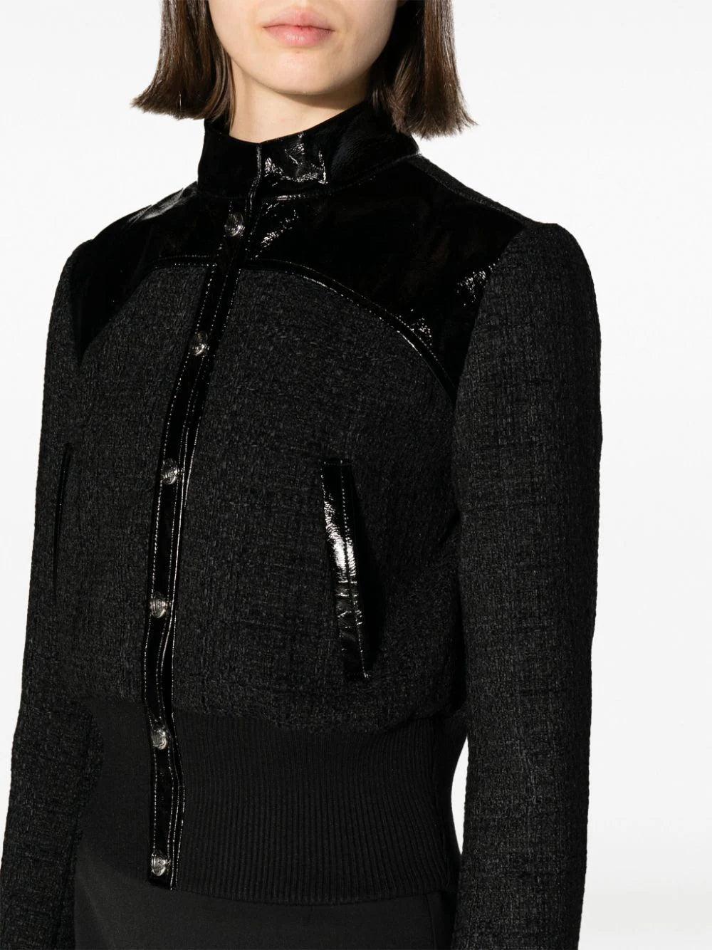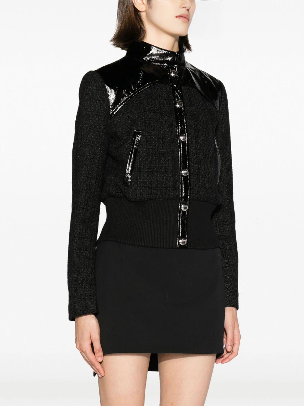 With a bold and daring style. this jacket adds an edge to any outfit. while providing warmth and protection. Take on any challenge in style with its unique patent trim and tweed fabric.
