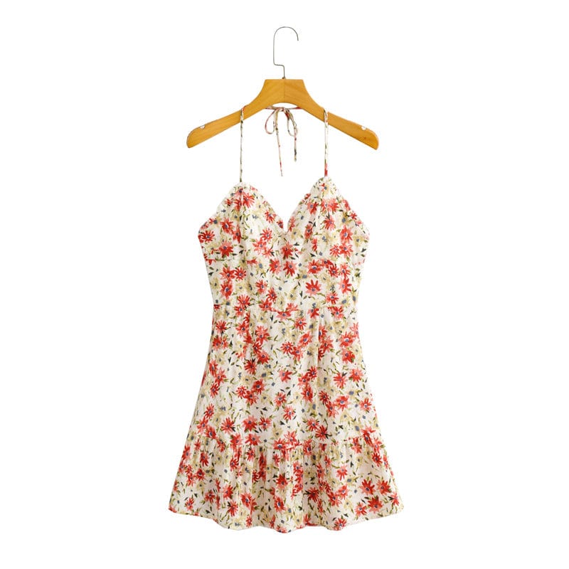Let the Persephone Boho Mini Dress be an ode to your inner free-spirit! A lightweight and breezy cotton fabric. adorned with floral pattern and a ruffled skirt. gives you the perfect fit and a flirty look. Tying its halter neckline with spaghetti straps. ensures it's ready-to-go for any adventure. Show off your boho style in this cami dress!