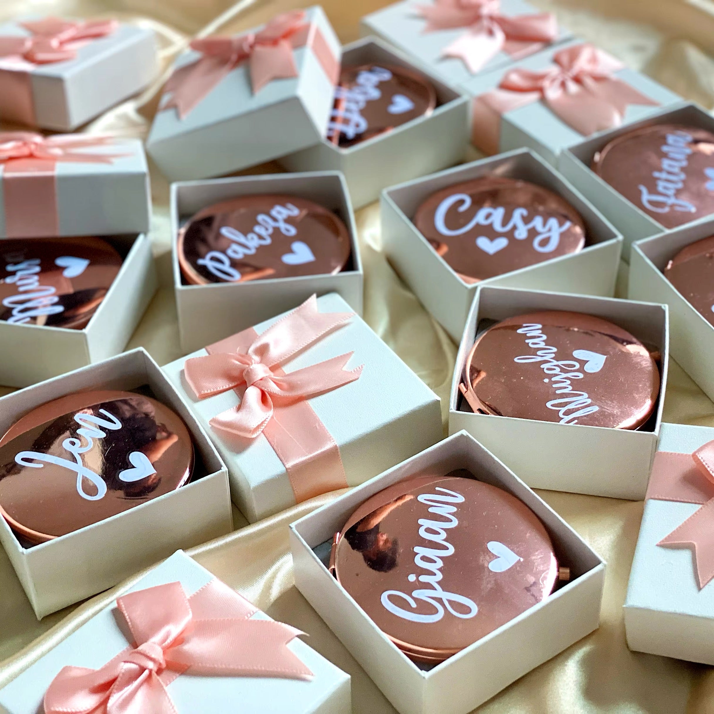 This personalized mirror is perfect for brides. bridesmaids. or as a thank-you gift for wedding guests.