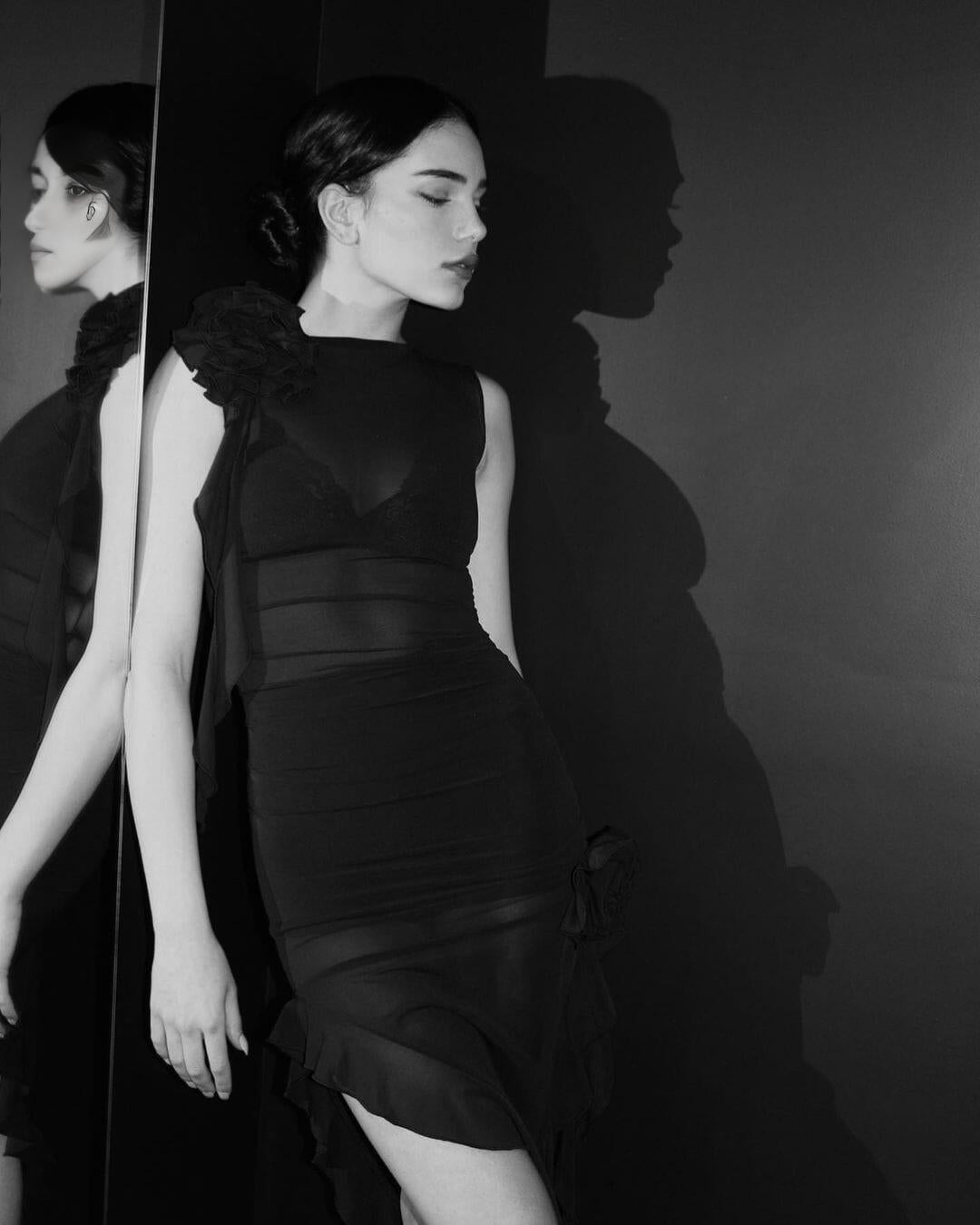 What sets this dress apart from others is the unique design element of a sheer panel across the chest and shoulders. This adds a daring and contemporary twist to the classic midi dress. making it a standout piece for any occasion.