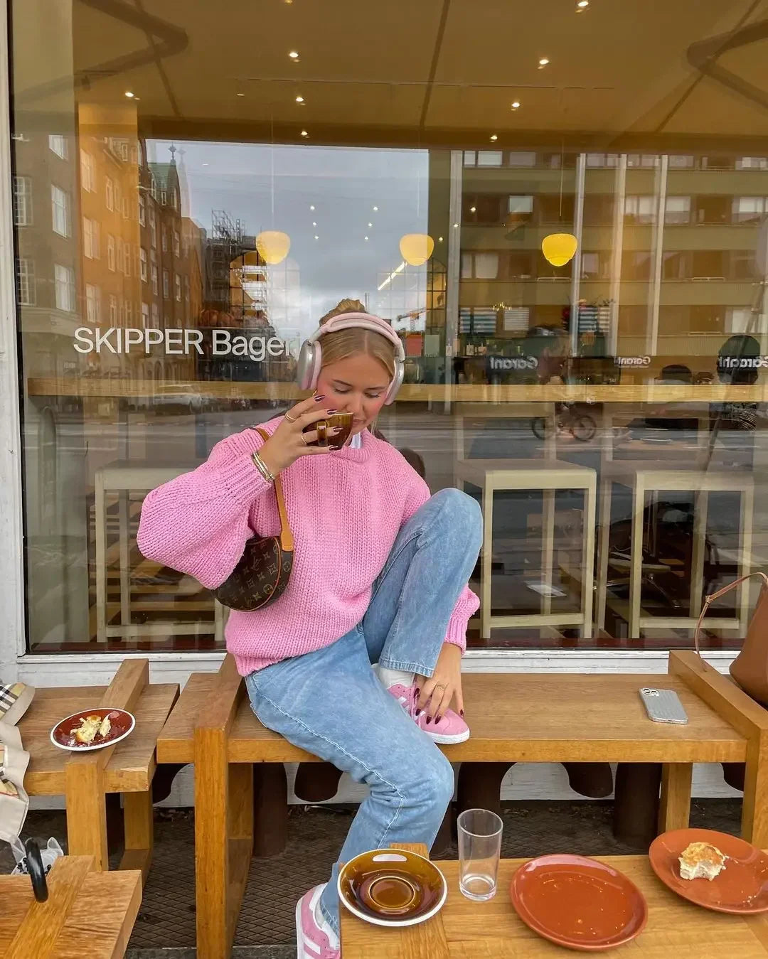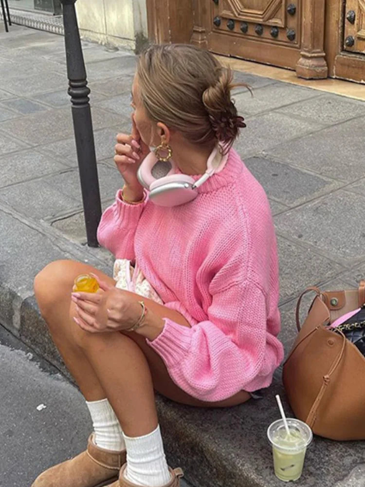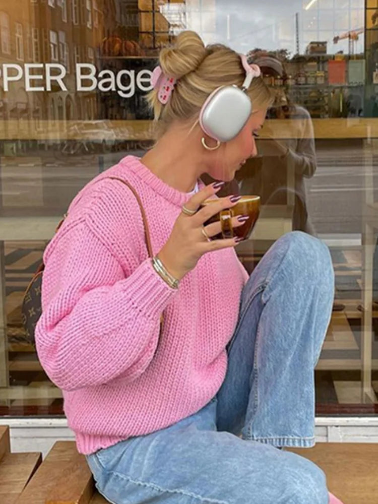 Pink O Neck Long Sleeve Knitted Pullover For Fashion Loose Thick Warm Sweater