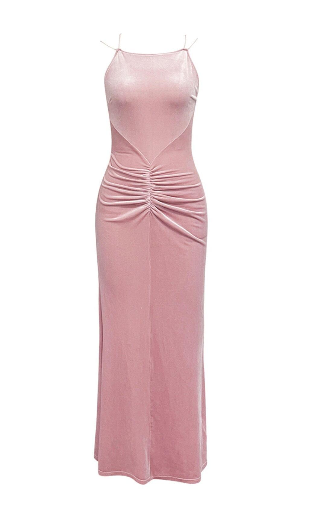 This lavish PINK SUSPENDER BACKLESS VELVET PLEATED HIP DRESS is sure to make a statement. Crafted from the finest velvet. this stunning dress hugs the curves in a sophisticated way. with intricate pleating and daring backless suspenders for an exclusive look.