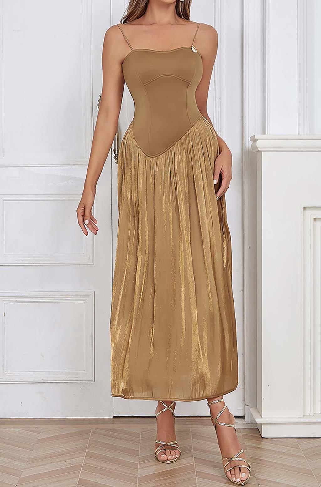 Introducing our Pleated Strap Midi Dress in Tobacco - a true embodiment of refinement and elegance. This dress is designed to charm with its delicate straps and knife pleated dress. offering both refined texture and graceful flow.