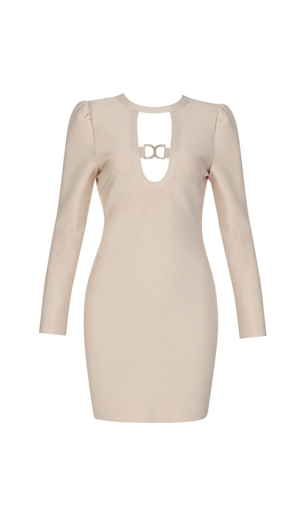 Get ready to turn heads in this stunning Plunge Bandage Mini Dress in Nude. Perfect for romantic dinner dates. champagne with the girls. cocktail bars. and party nights. this dress is designed to make you look and feel fabulous.