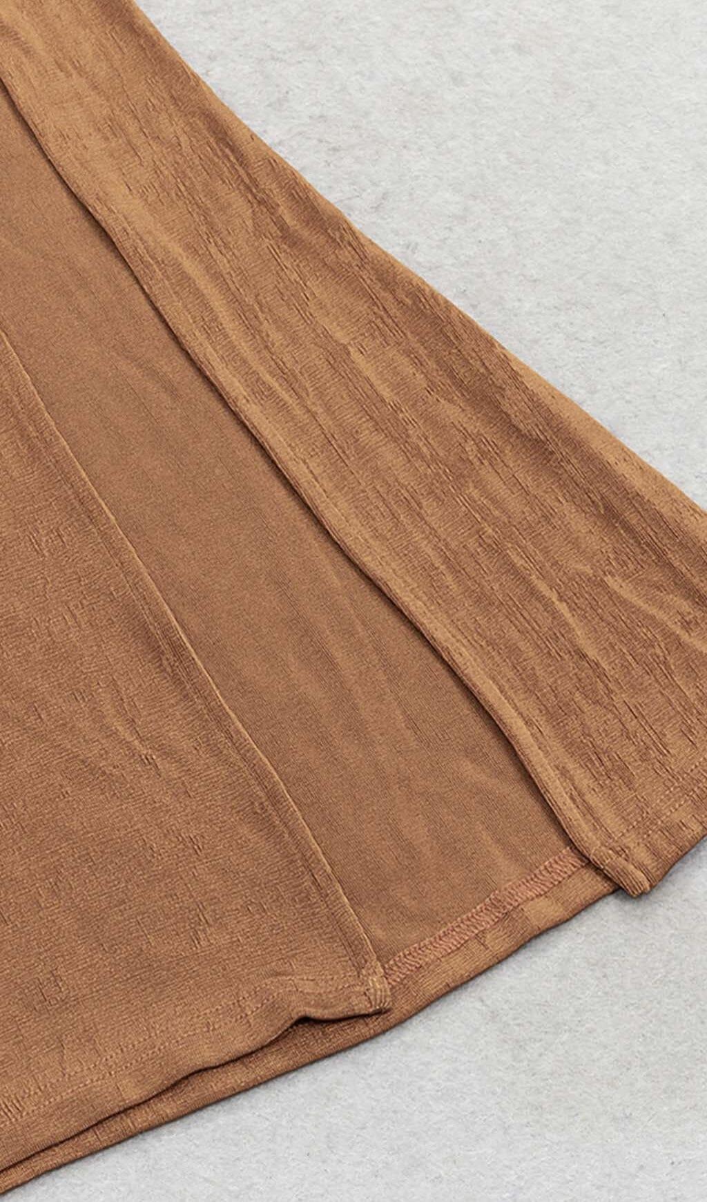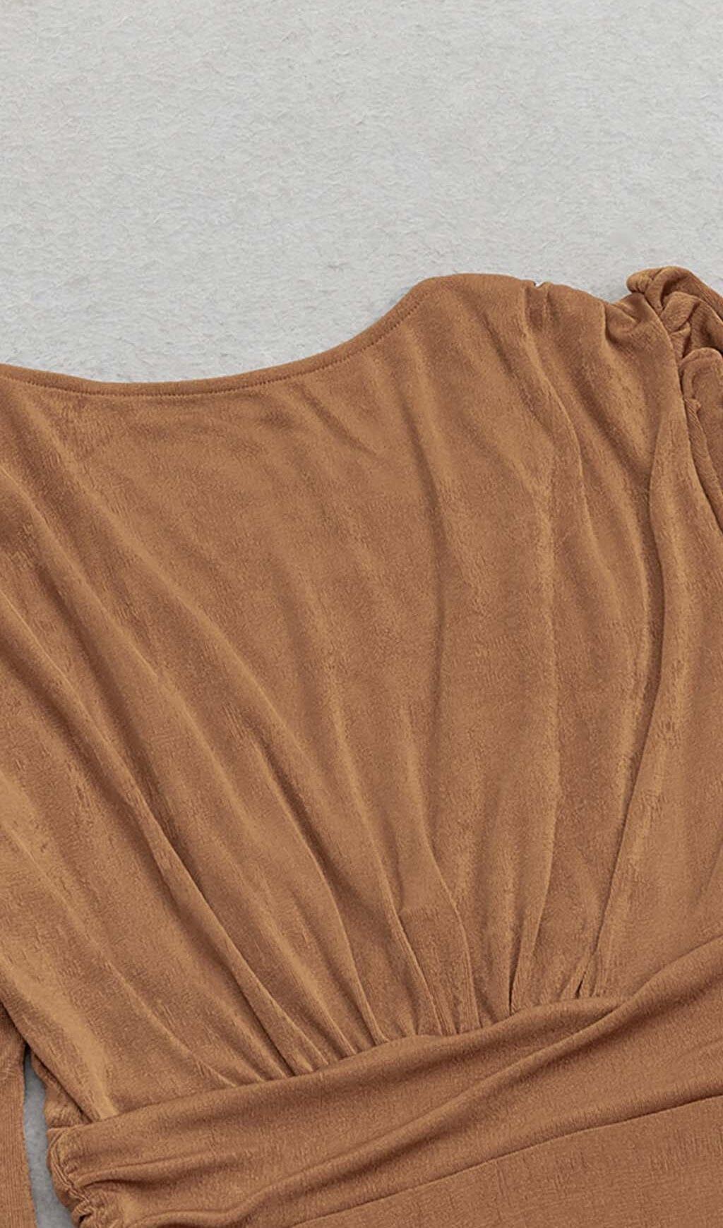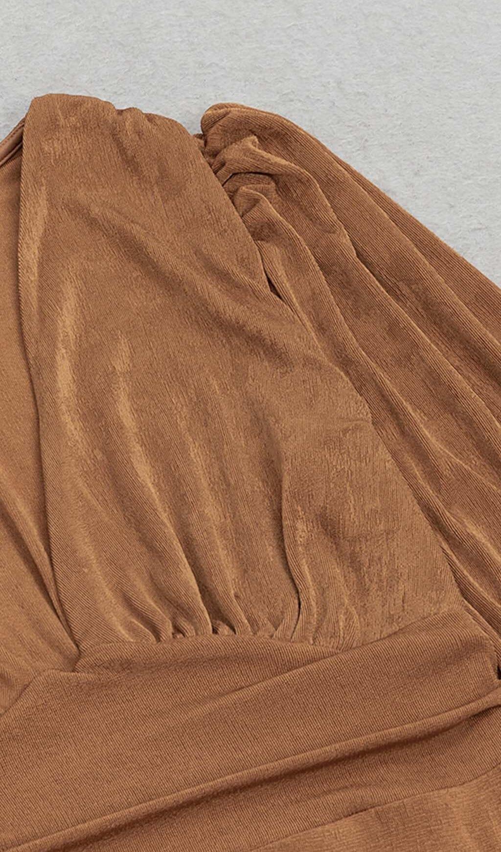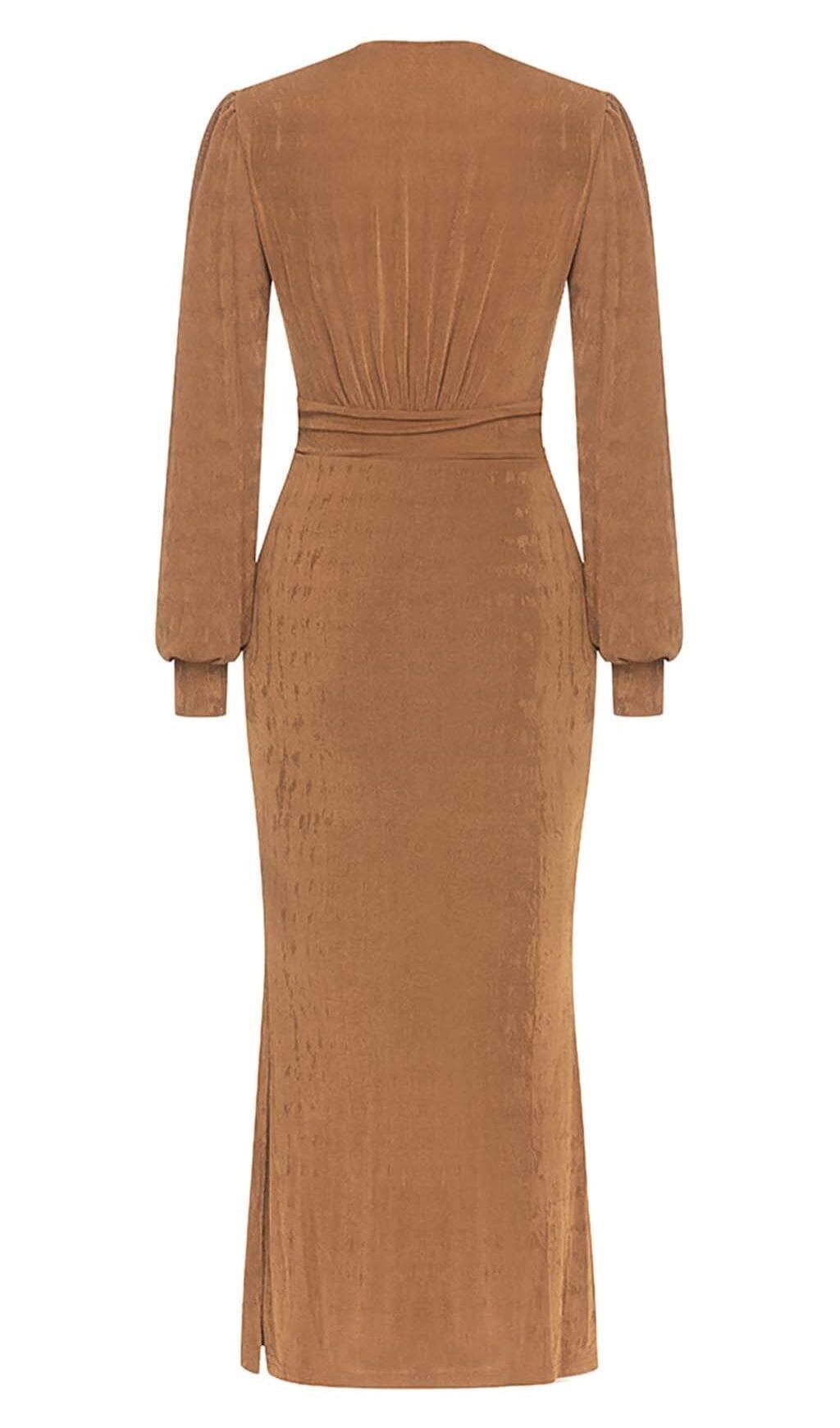 Elevate your style with our Plunge Long Sleeve Midi Dress in Brown. Shop now and experience the perfect blend of sophistication and allure!