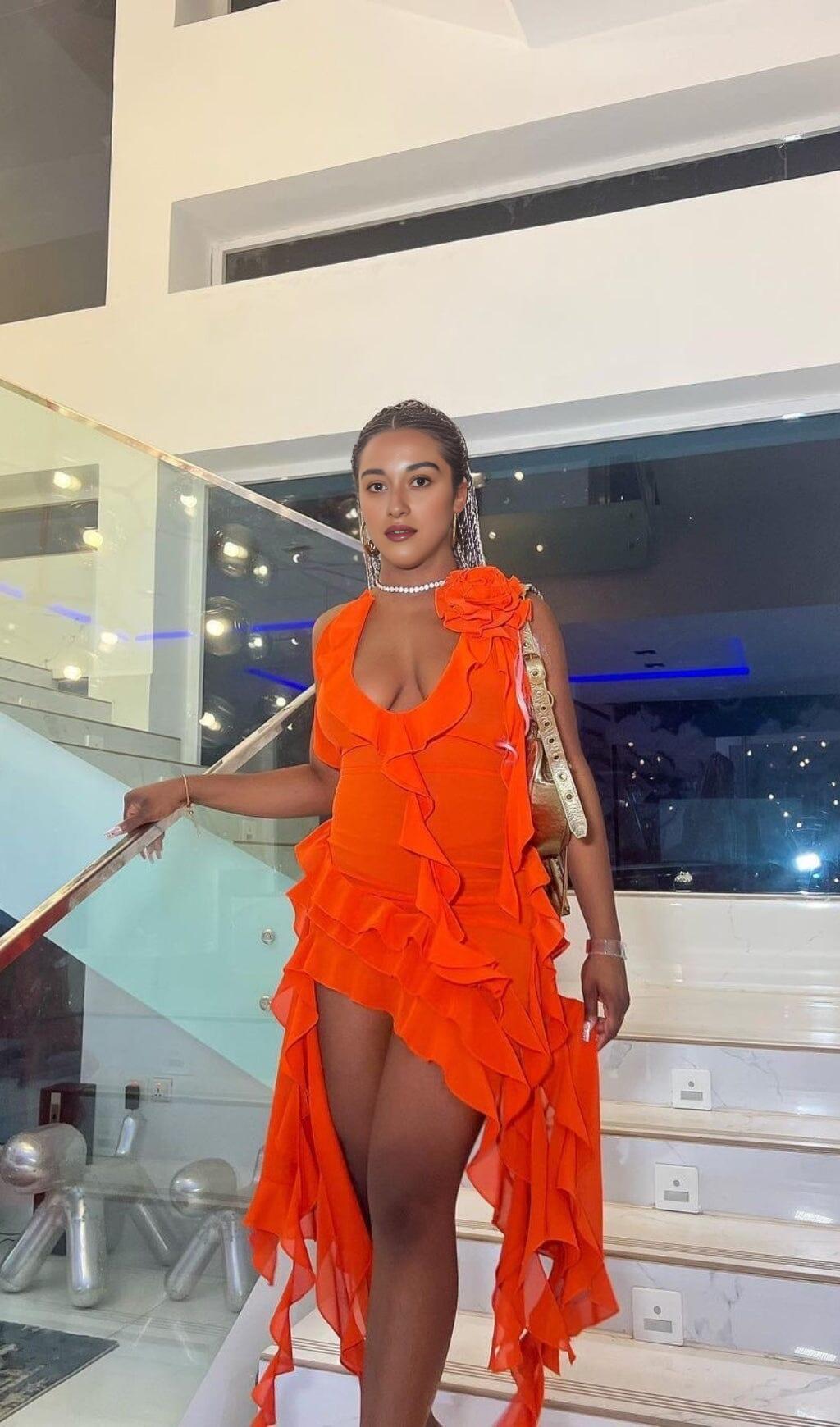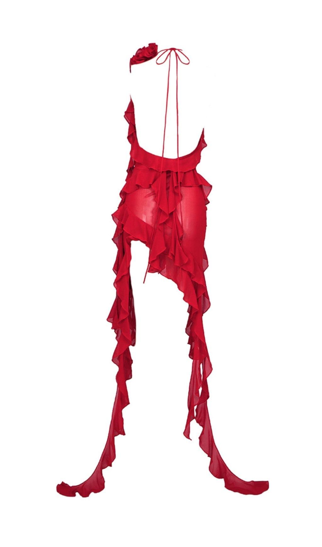 Make a statement and steal the spotlight with our Plunging Neckline Ruffle Dress in Red. This dress is designed to make you the center of attention. with its captivating ruffles that cascade from the deep v-neckline to create a truly show-stopping look.