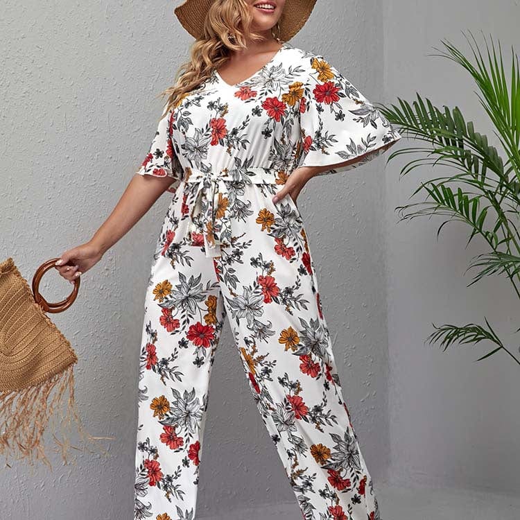 Look good in any size with the Plus Size Hollyhock Jumpsuit! It features a bold and beautiful floral pattern. a flattering V-neck neckline. trumpet sleeves. a matching belt. full pants. and a cool & comfortable summer-ready Polyester material. It's sure to be your go-to jumpsuit all season long!
