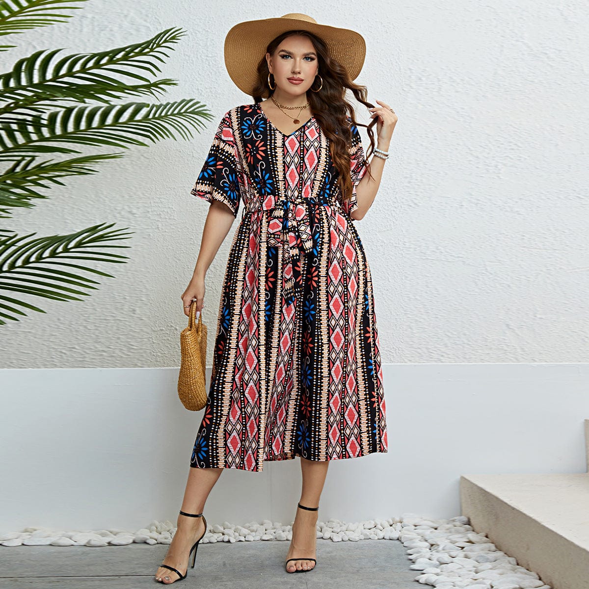 Look your boho best in this Plus Size Lydia Midi Dress! Featuring a geometric pattern. V-neck cut. and complimentary matching belt. this lightweight and airy dress is the perfect statement piece for any occasion. Plus its cool 1/2 sleeve and A-line shape will have you feeling breezy and lookin' stylish! Go ahead and rock the house!