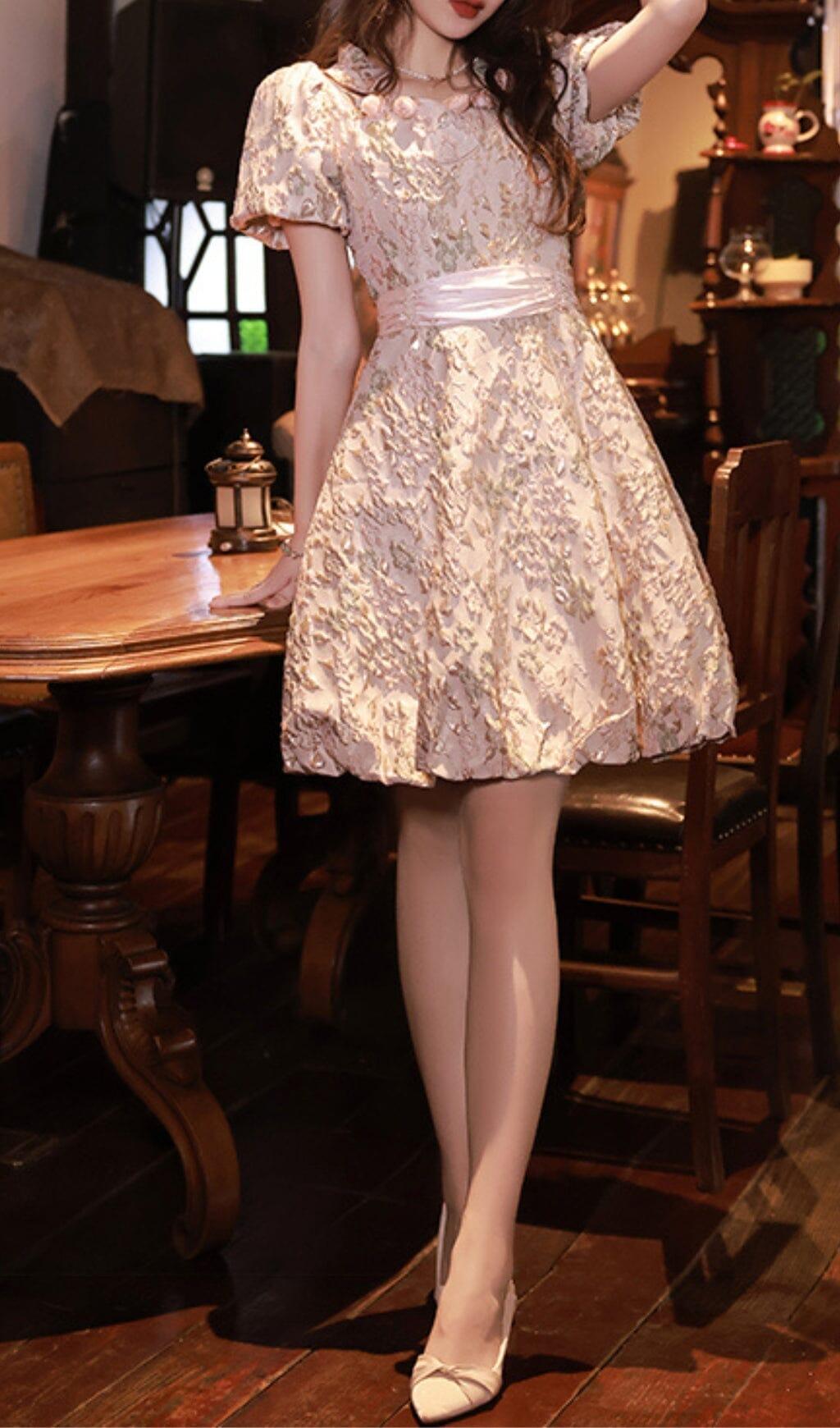 Elevate your style and be the center of attention with our ethereal Puff Sleeve Cutwork Midi Dress in Powder Pink. This dress features voluminous puff sleeves and intricate cutwork at the round neckline. creating a stunning and angelic silhouette. The slim skirt adds a touch of elegance. while the adjustable self-tie belt offers waist-defining polish.