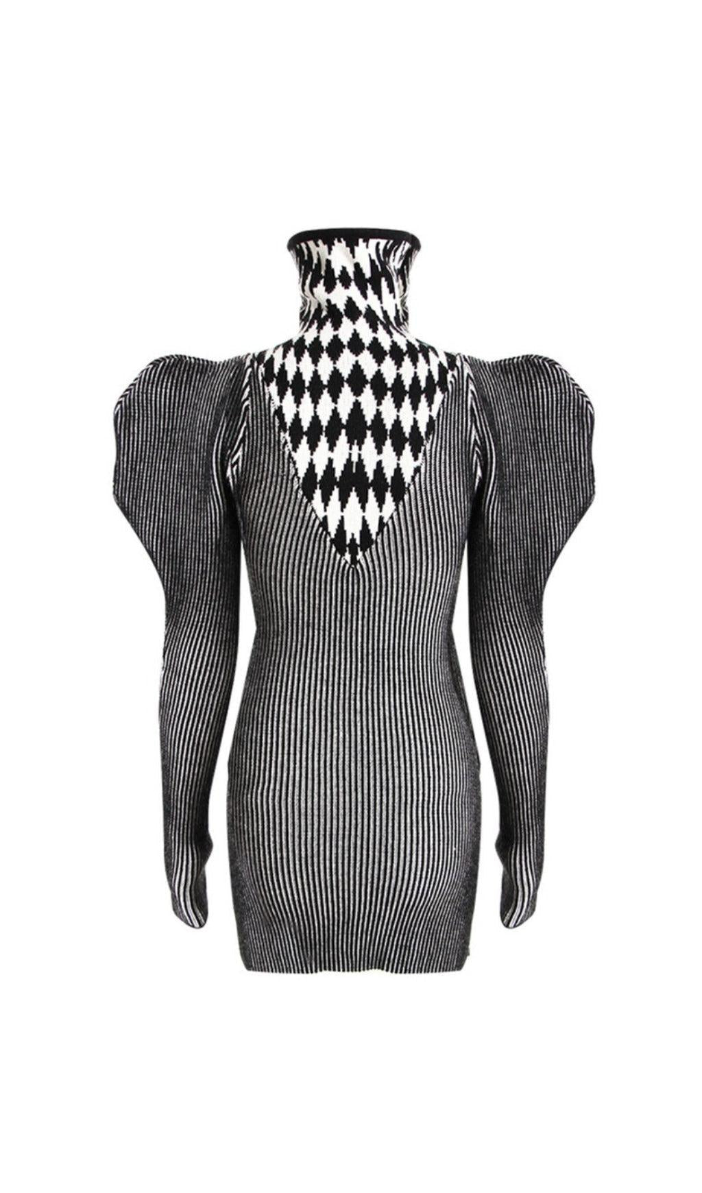 Stay chic and cozy with our Puff Sleeve Geometric Knit Dress. Crafted with geometric patterns and featuring puffed sleeves. this dress will make a statement while keeping you warm. Perfect for any occasion. this dress is a must-have for any fashion-forward wardrobe.