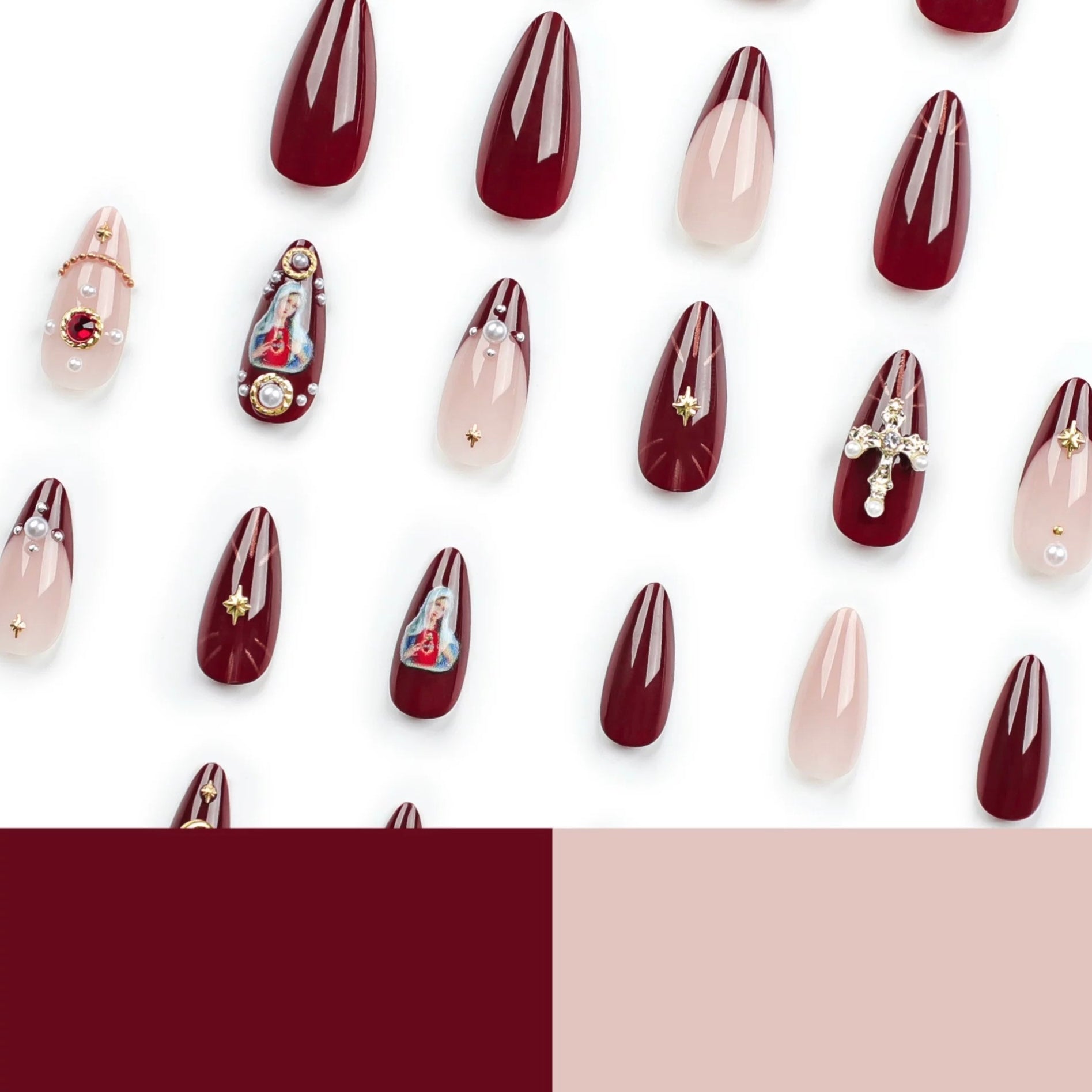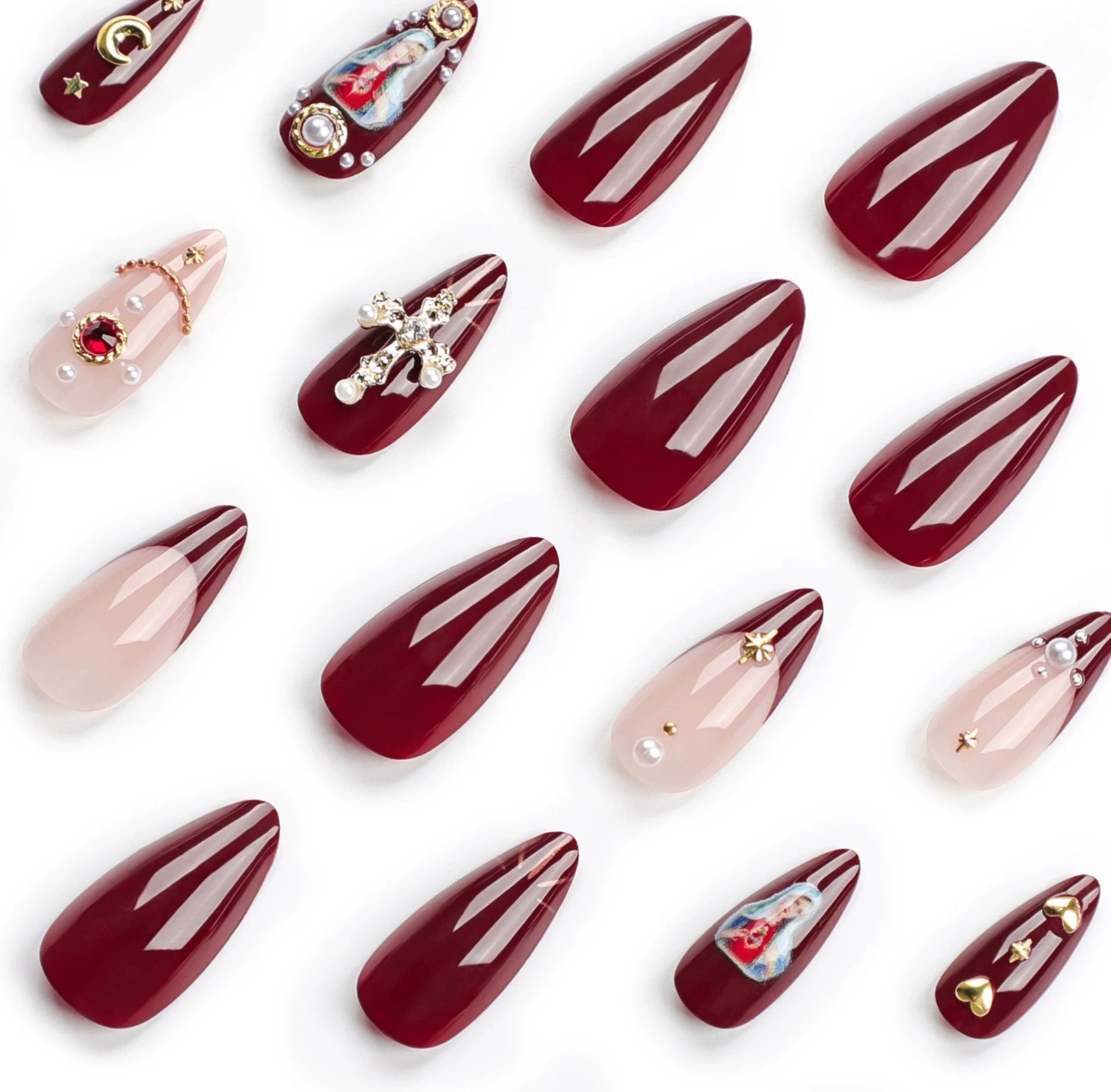 Elevate your manicure game with our stunning Red Baroque False Nails. a perfect blend of Y2K girl aesthetics and baroque elegance. This 24-piece set features cross nails design and pink gradient almond shapes. offering a wearable fake nail solution that exudes gem glitter and French design sophistication. Crafted for artistic expression. these press-on nail tips are adorned with gold moon star design and full coverage for a glamorous look.