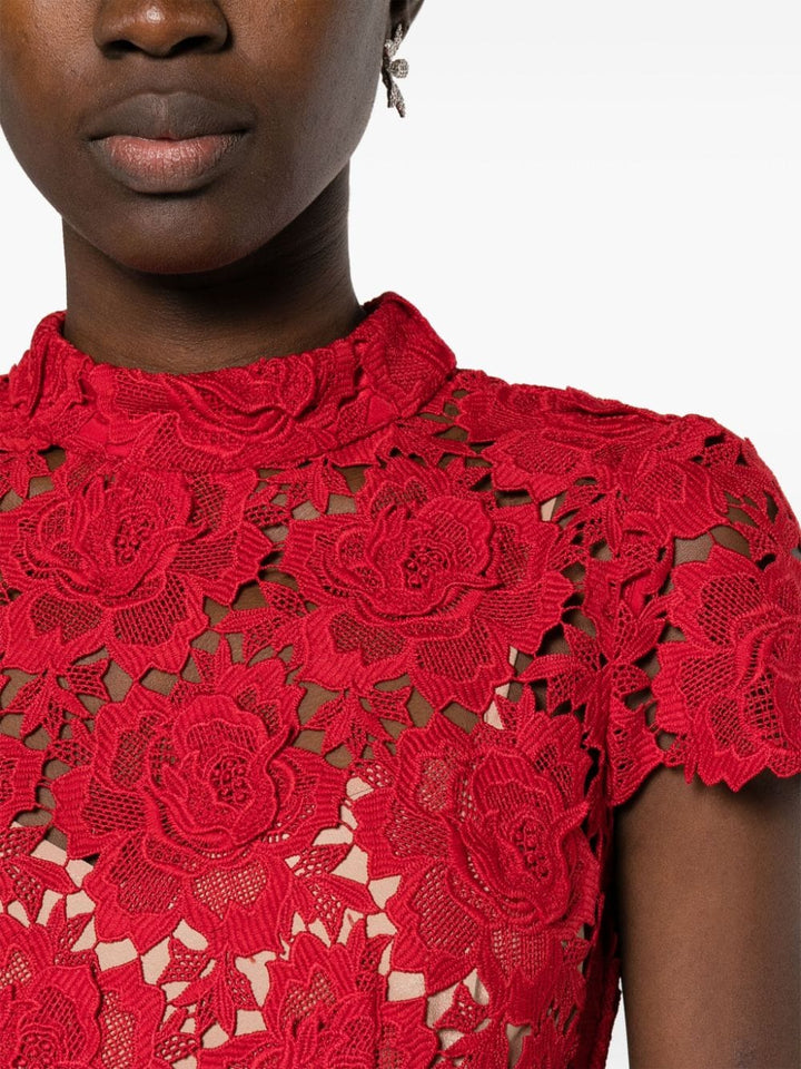 This midi dress is sure to make you bloom with its stunning red flower lace design. Perfect for any occasion. it's both elegant and playful. Embrace your whimsical side with this unique addition to your wardrobe.