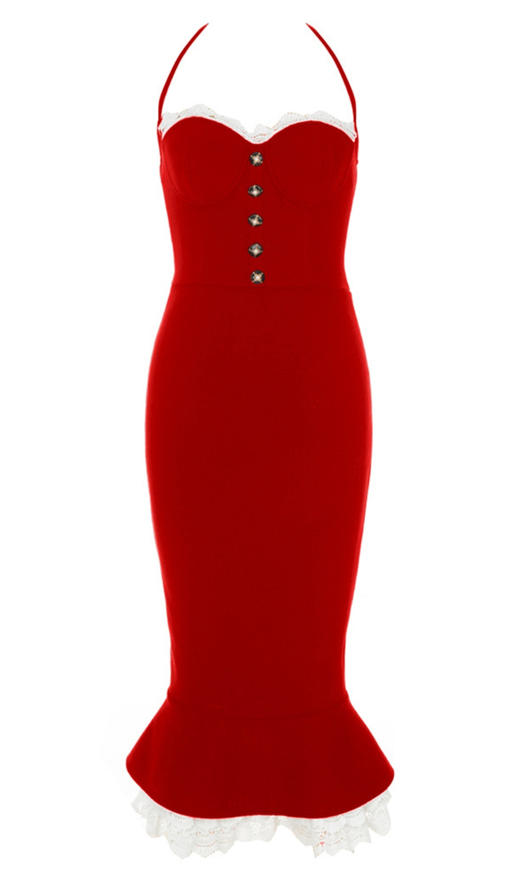 Take a daring step with this dress! With its bold red color and mermaid hem. be the center of attention. Embrace your adventurous side with this lace bandage dress that demands attention. Effortlessly make a statement in this must-have piece!