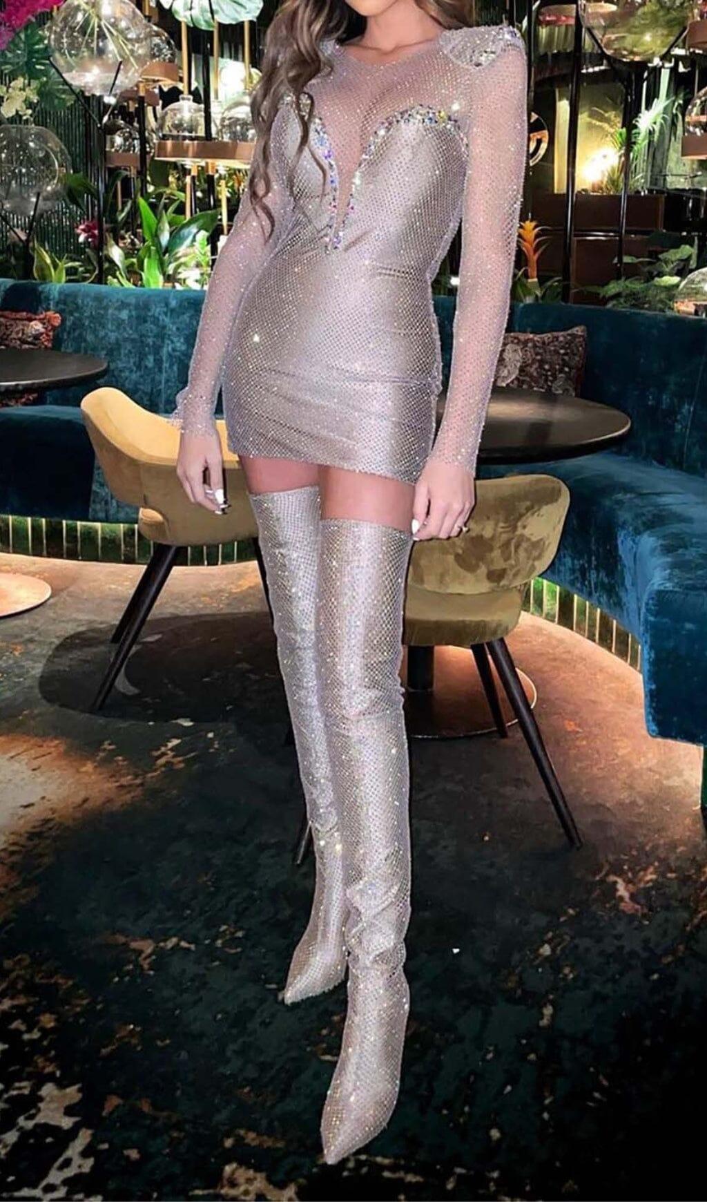 Don't miss out on the chance to shine in the Rhinestone Mesh Mini Dress in Silver. Order yours today and get ready to turn heads wherever you go!